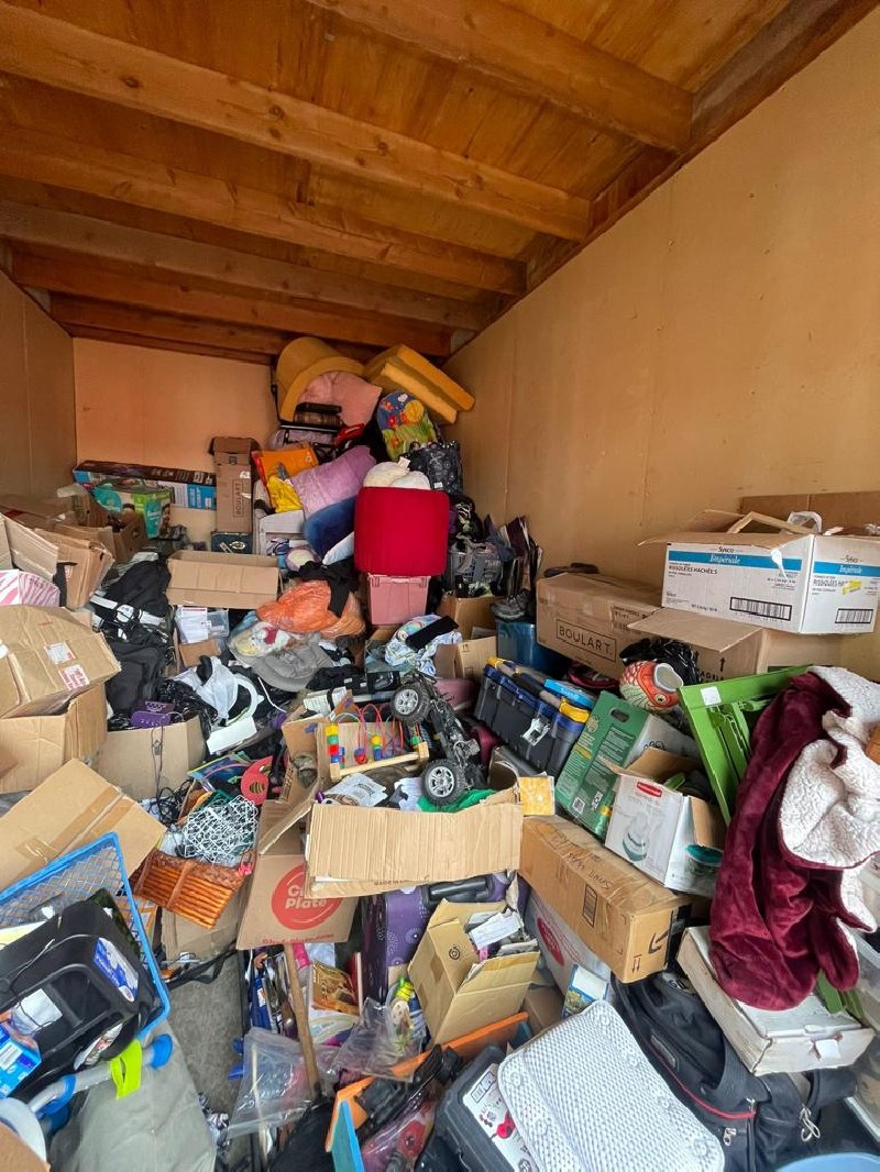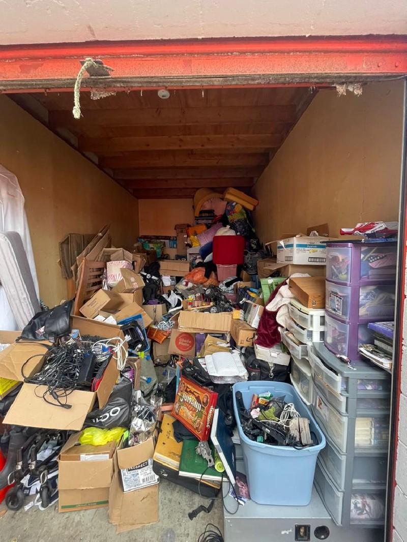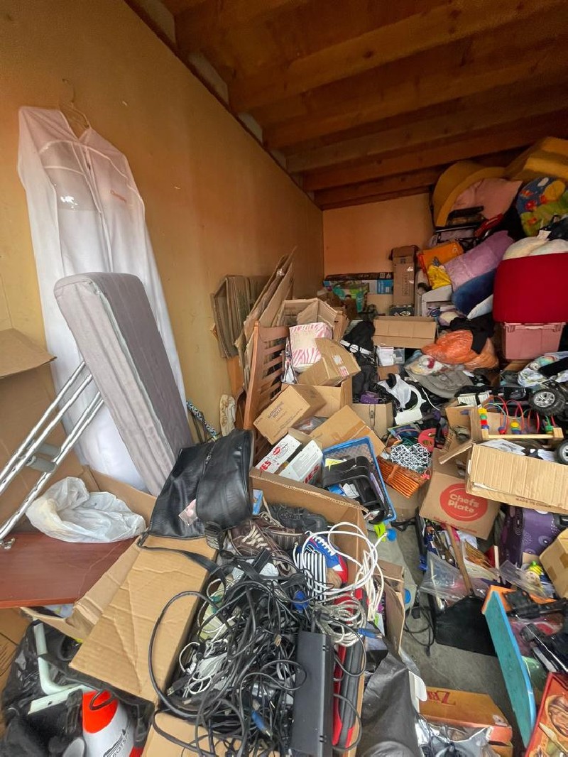Many cardboard boxes, plastic containers, throw blanket, (looks like) tool kit, kid's toy, clothes, wires/extension, furniture goods, and much more. Unable to see all the content of the locker due to the it's packed!