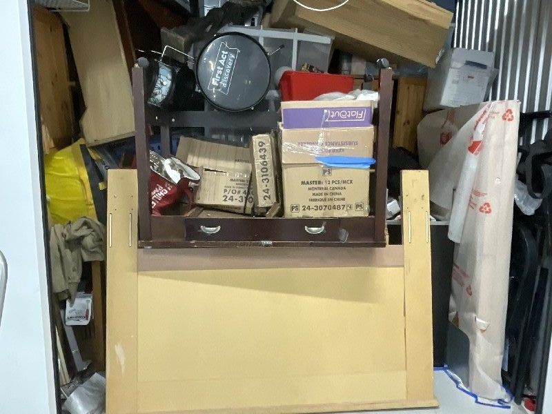 drums, artwork, furniture, boxes, bags, bed frame, vacuum, clothing