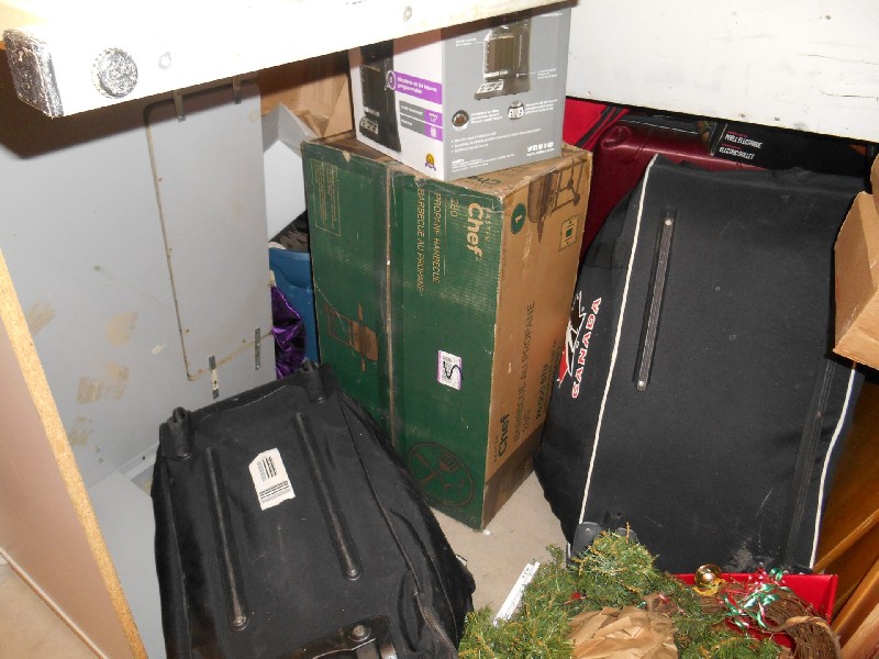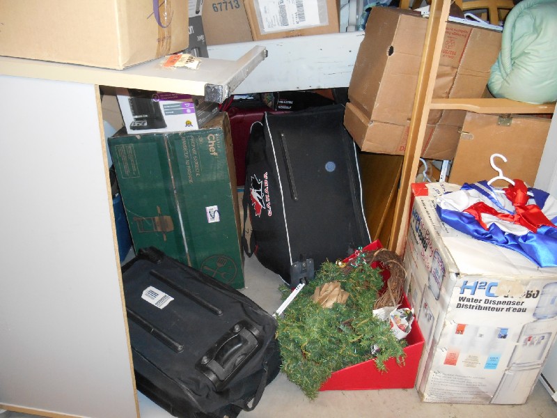 2 Hockey bags, lots of boxes, desk, table, 3 chairs, dresser with mirror, Christmas décor and more.