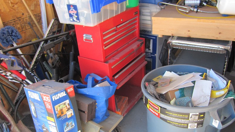 Boxes, speakers, charcoal grill, plastic bins, shovel, bolt cutters, table saw, bike rack and golf clubs.