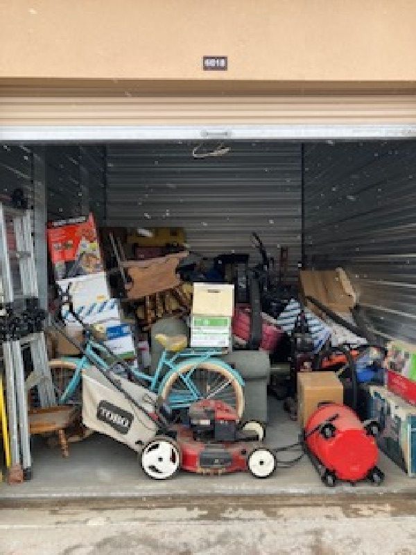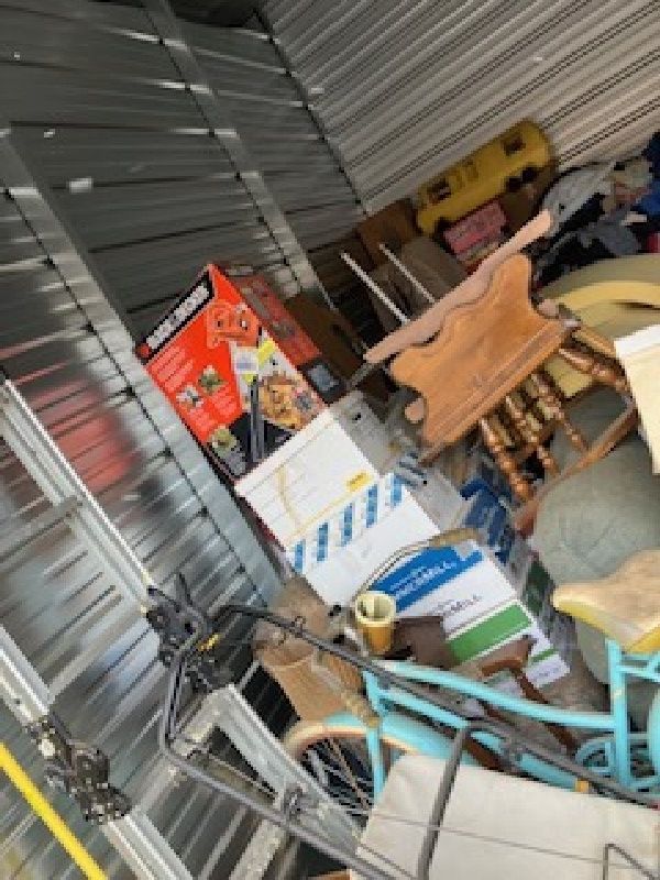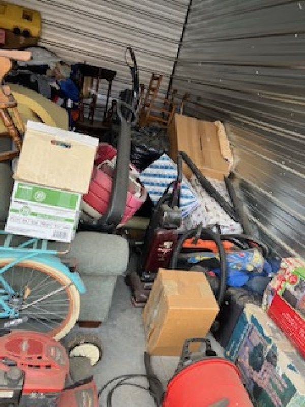 Couch, Chairs, Vacuum (2), Lawn mower, Bike, Ladder, Toys, Boxes
