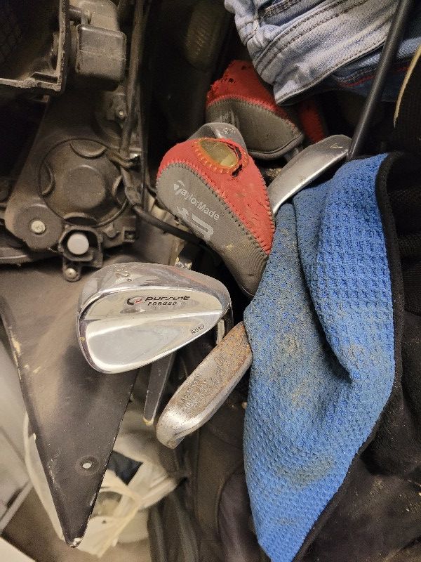 gold clubs, bicycle, couch, motorcycle stuff, mini cycle, toys,