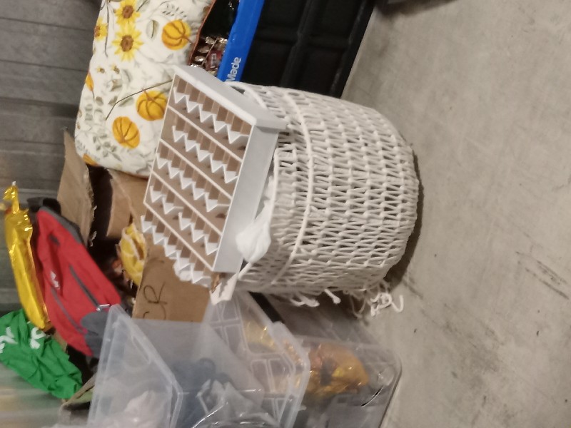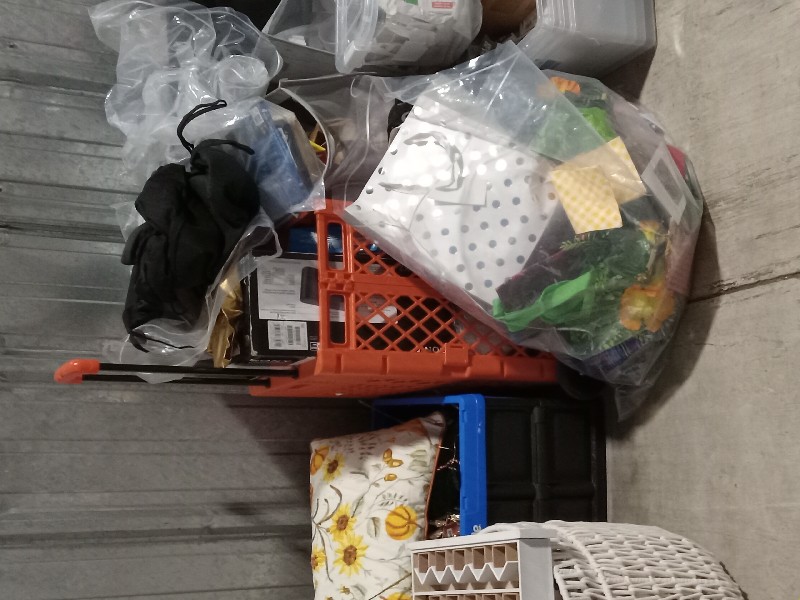 Boxes, bags, totes, advent calendar, Christmas decorations, clothing, books, plastic shopping cart on wheels.