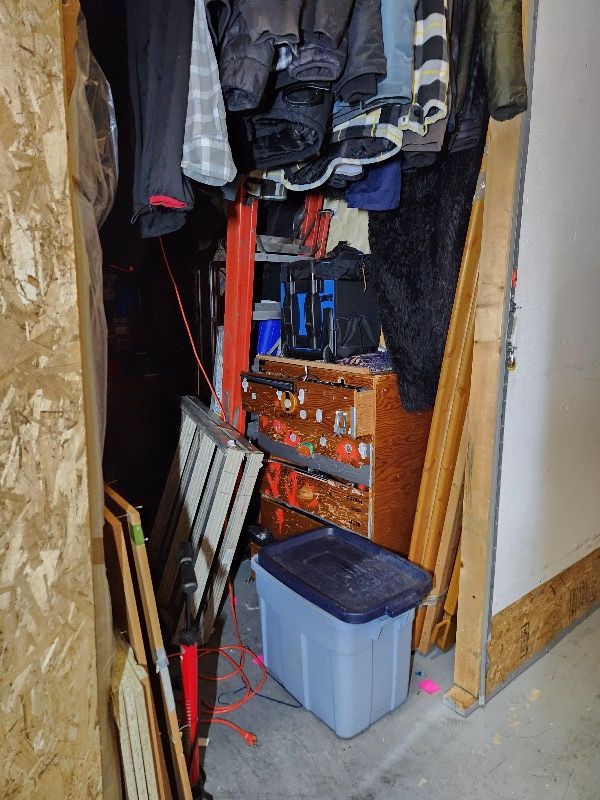 tools, ladders, stereo speakers, bike, desk, dresser, clothes, miscellaneous items