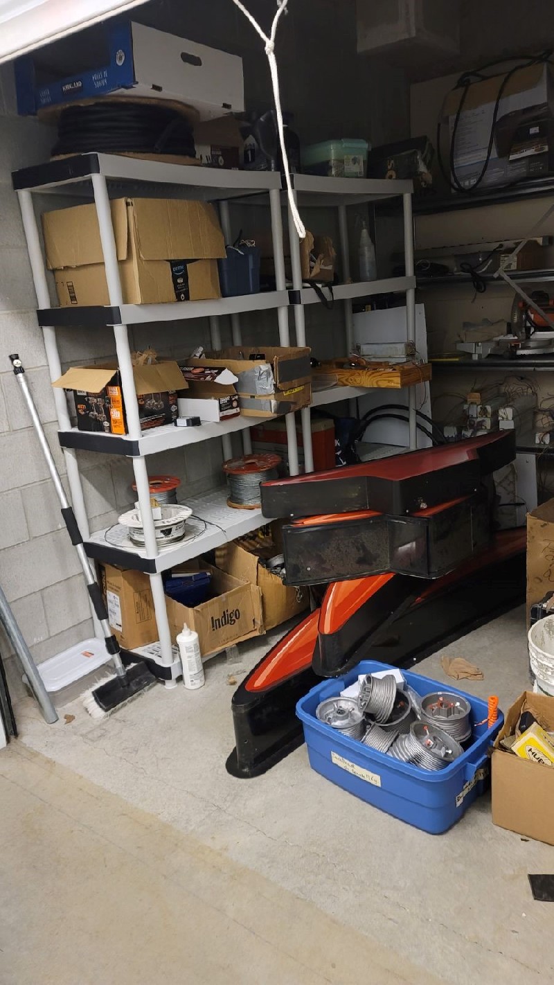 Couple of shelving units, wooden work table and quite a mix of tools and other workshop supplies.
