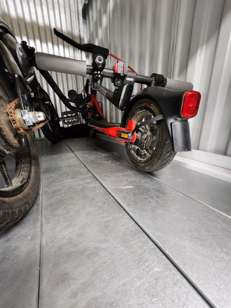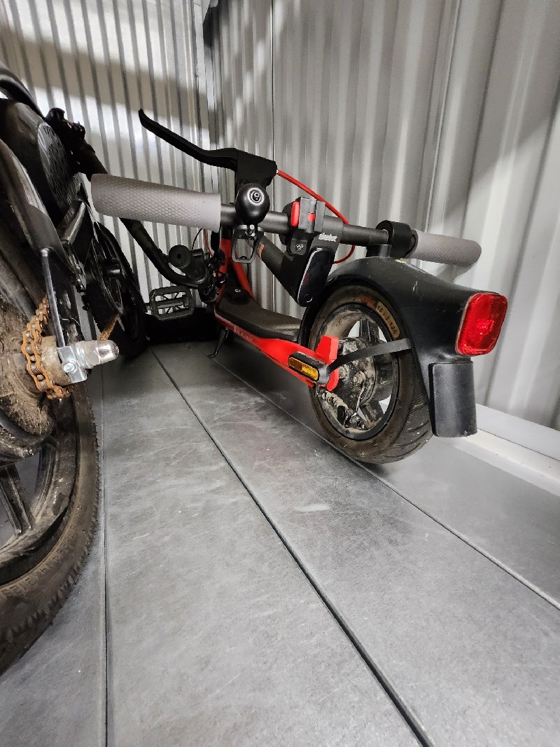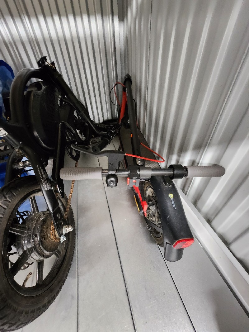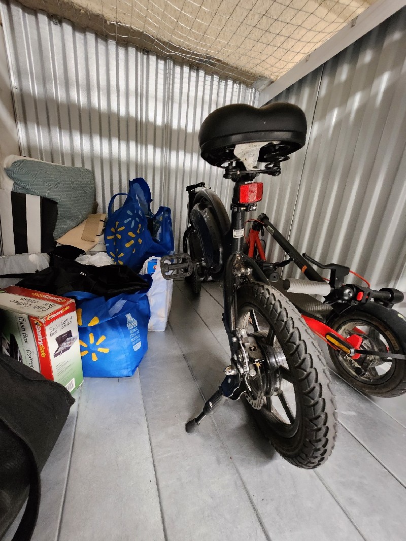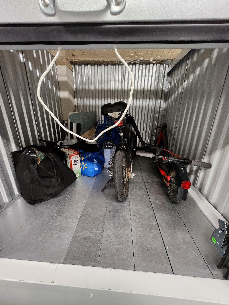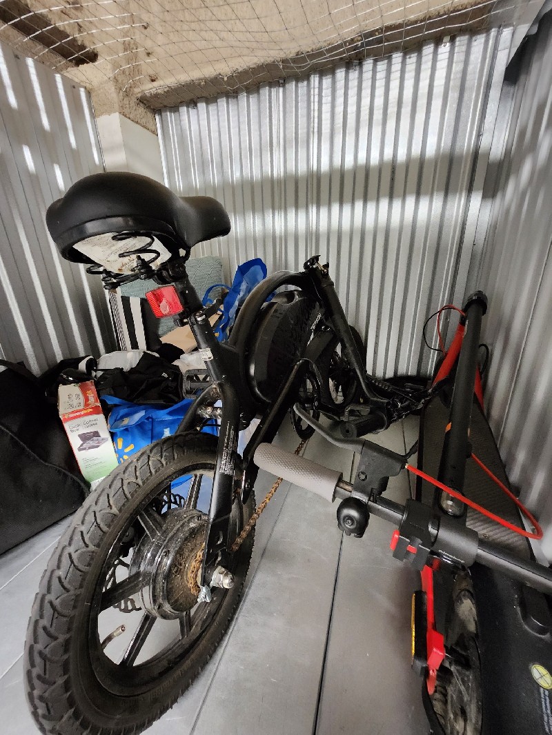 Clothing, personal items, misc. bags, electric bike - mini, cash box, e-skateboard (scooter)