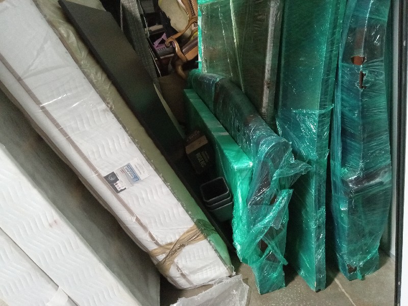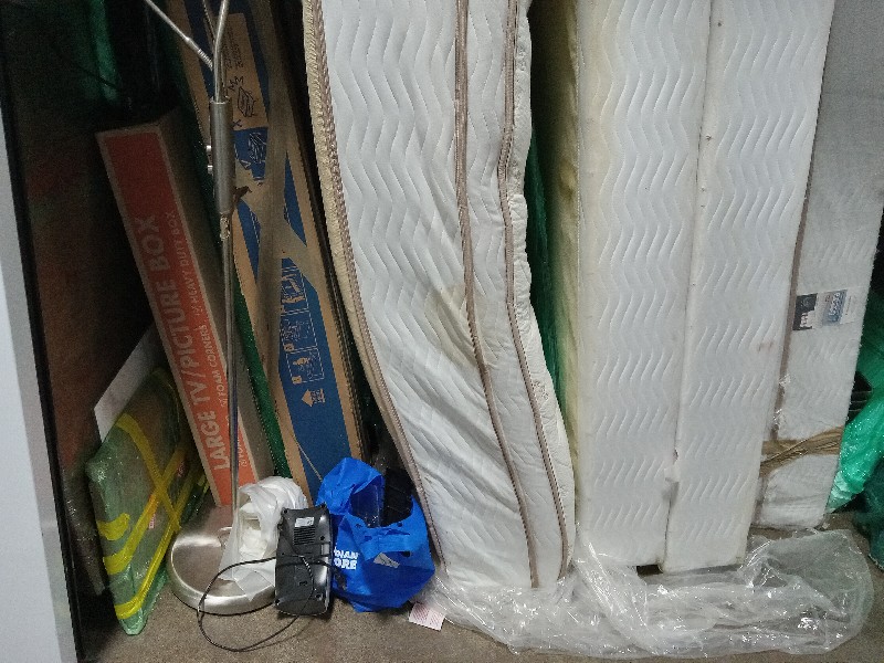 Furniture, mini fridge, lamp, bed frame, electronics, boxes,