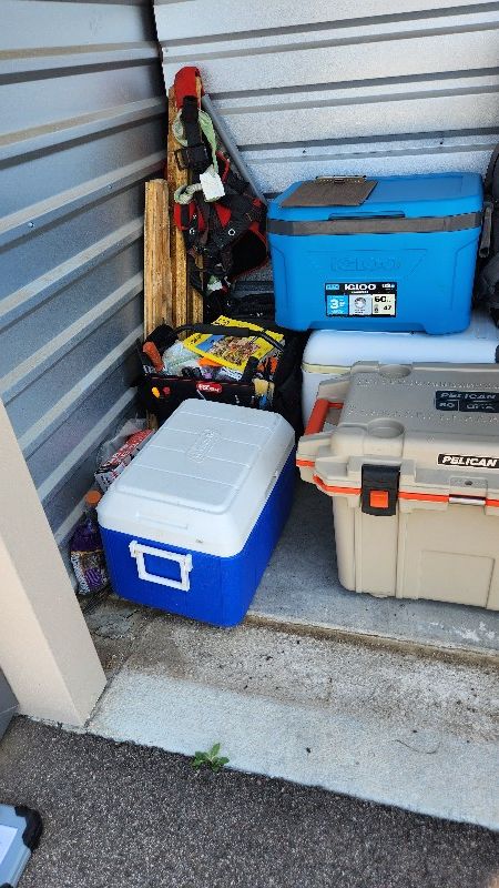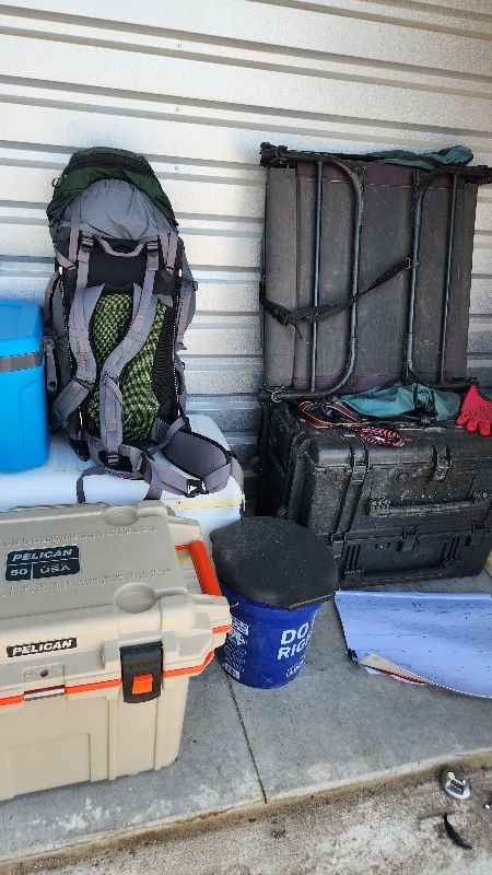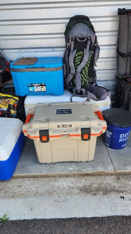 Pelican Boxes, Coolers, Tools, Hiking Backpack, Wood Piece, Misc camping items.