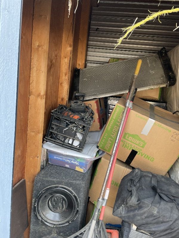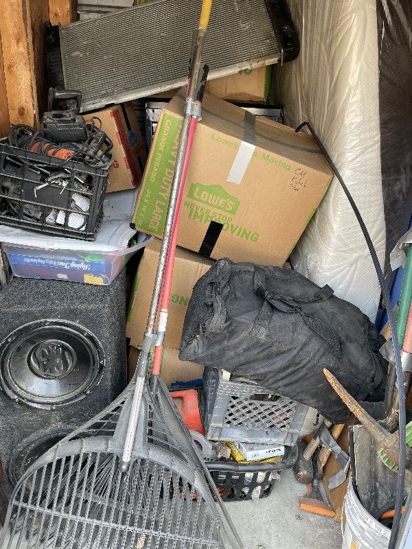 Lawn rakes, mattress, radiator, boxes, speakers, tools, large toolbox, dufflebag.