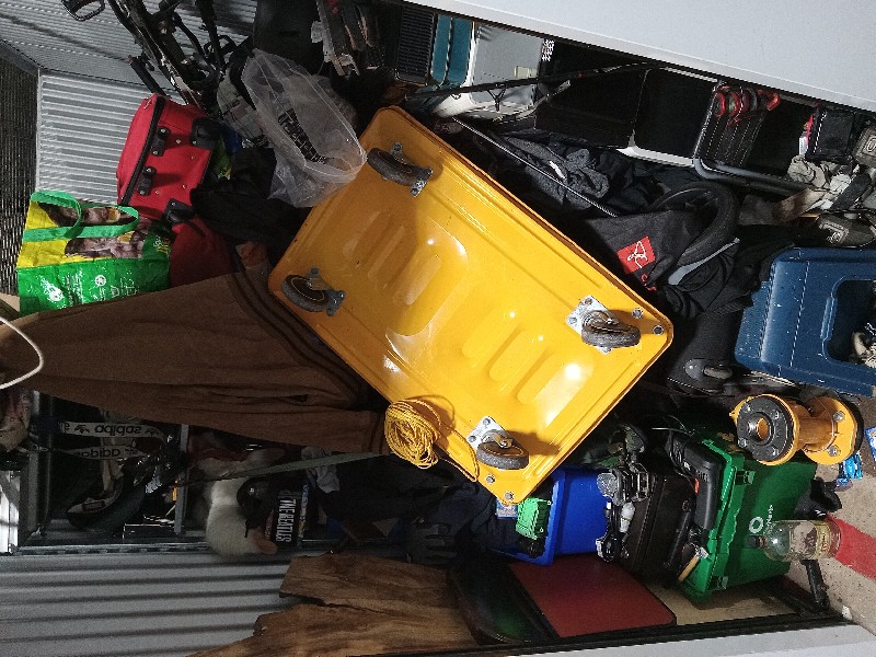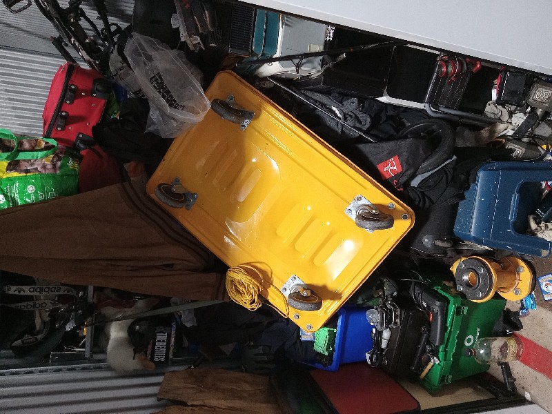 bags, fishing equipment, dolly, microwave, tools, totes