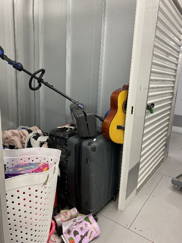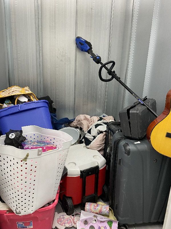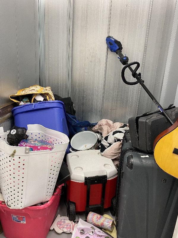 bins, cooler, suit cases, house hold items, weed wacker, guitar