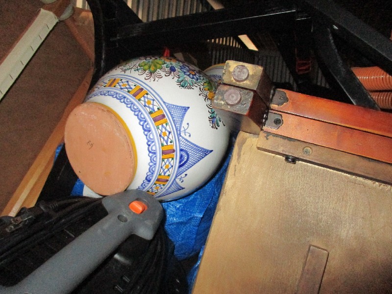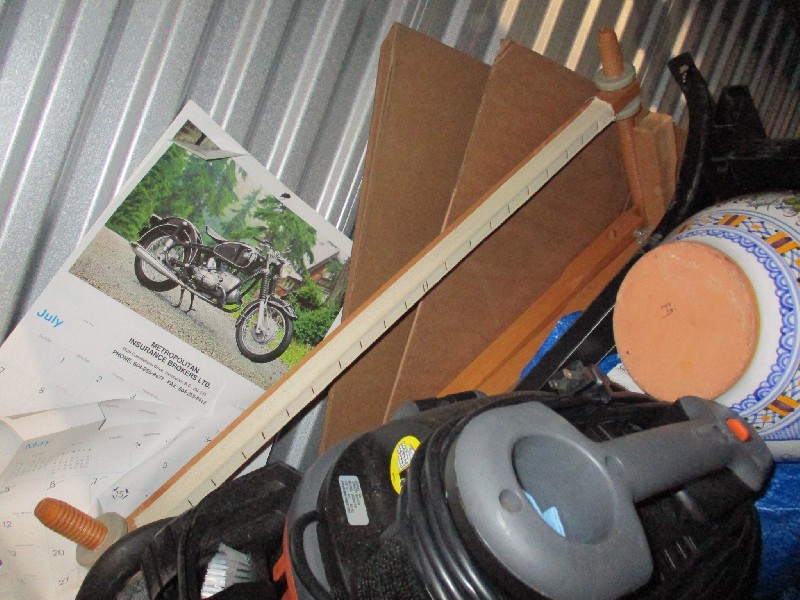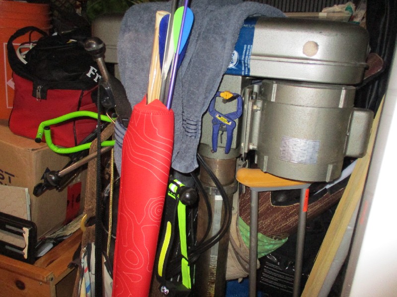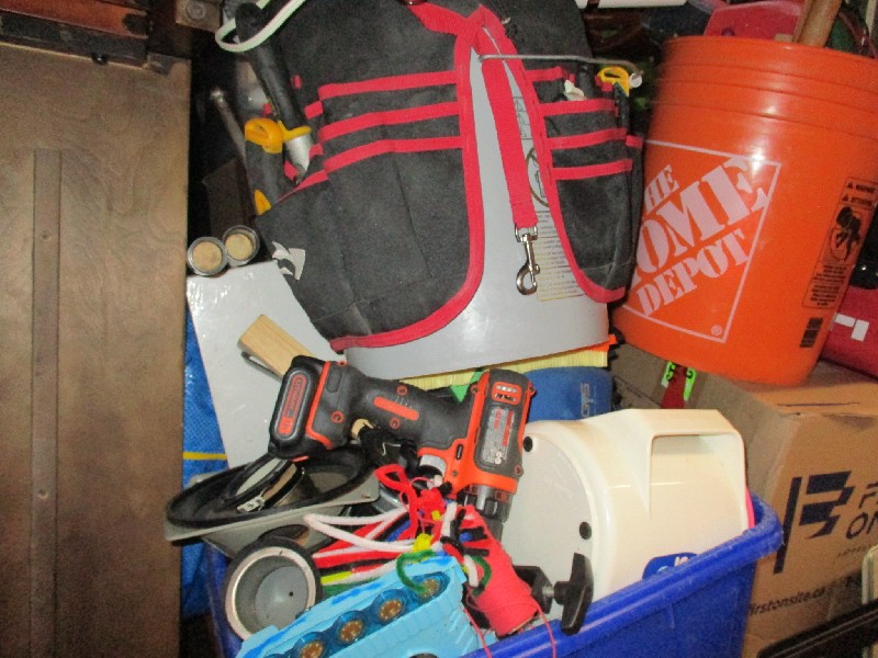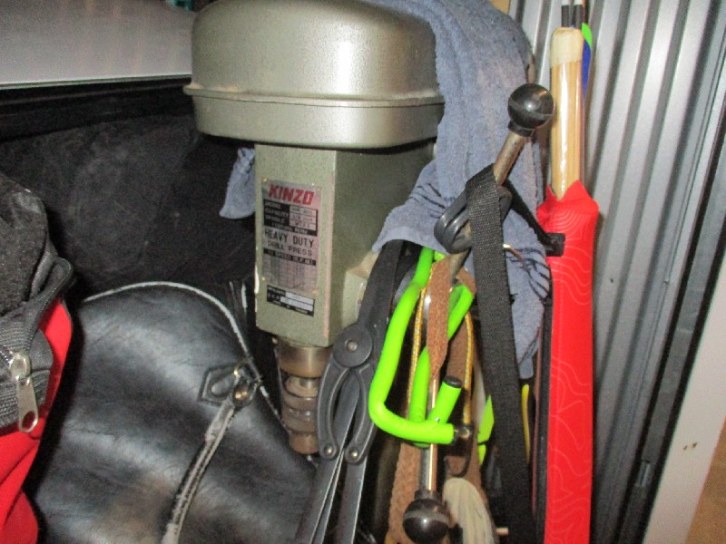 Quartz crystals, vacuum, stand up drill press, motor?, bicycle?, misc boxes, leather chair, tool box, tools