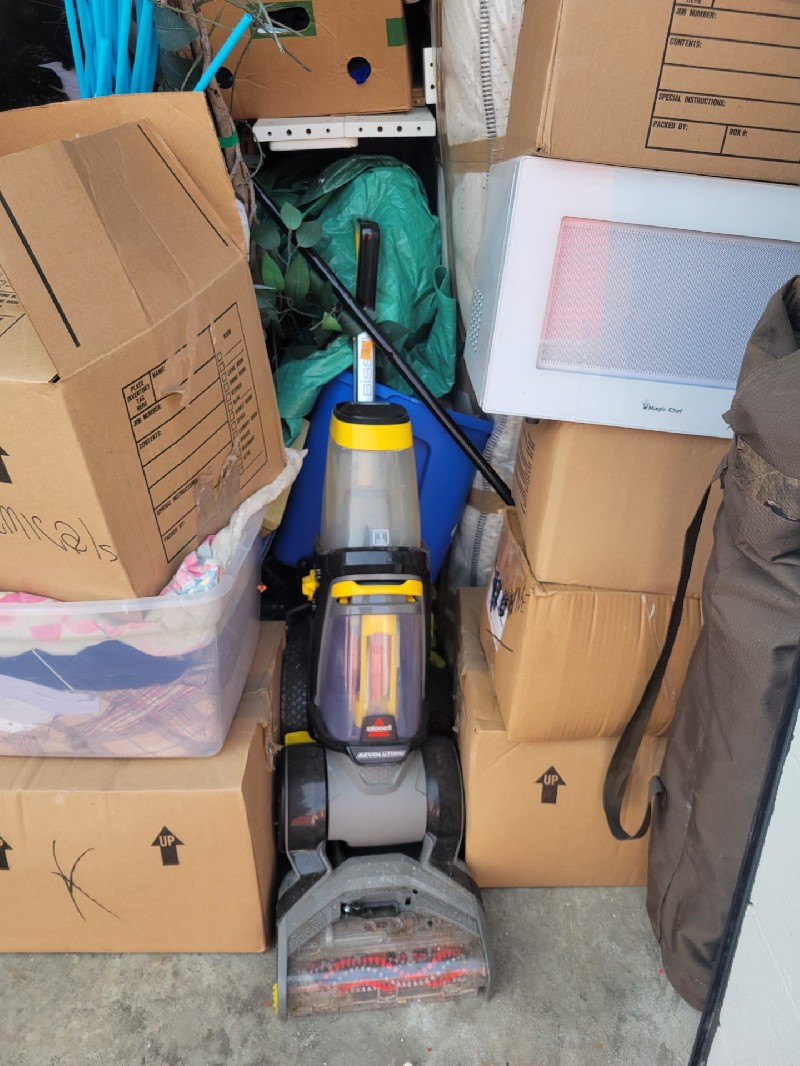 Boxes, totes, bags, suitcase, carpet cleaner, microwave, plastic organizer, mattress and box spring, child mattress, etc.