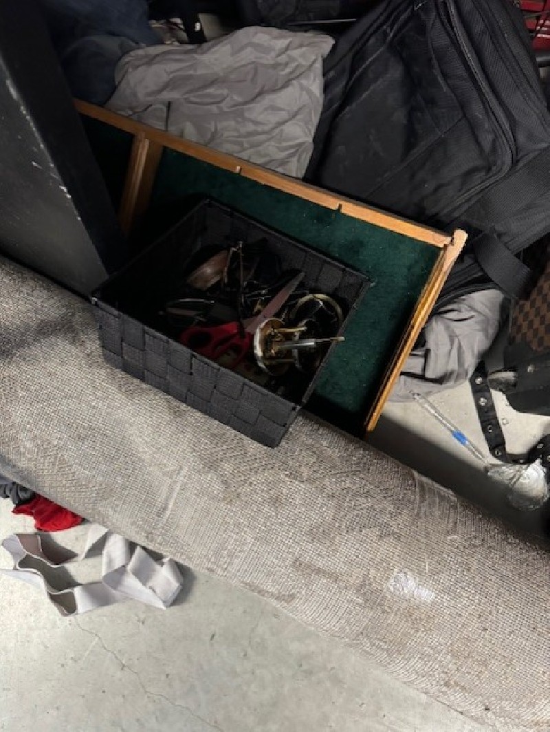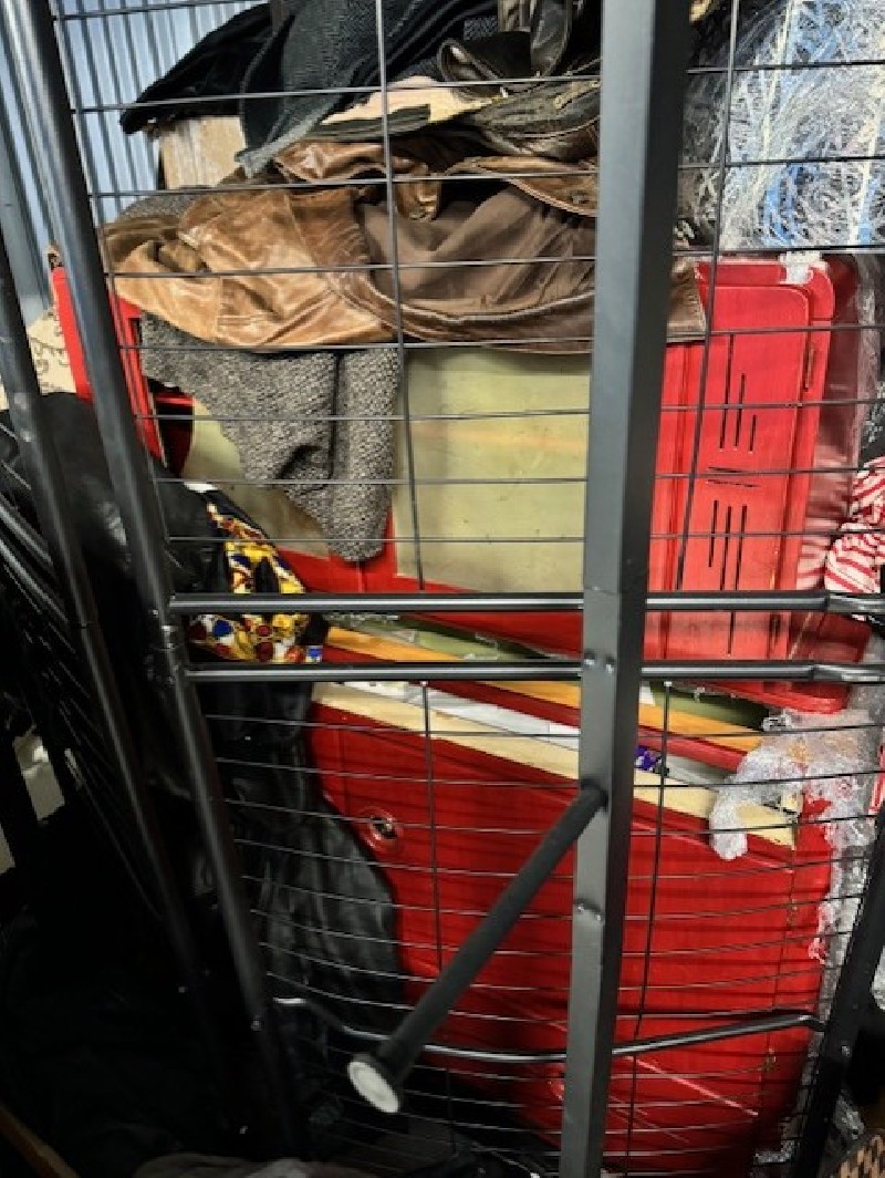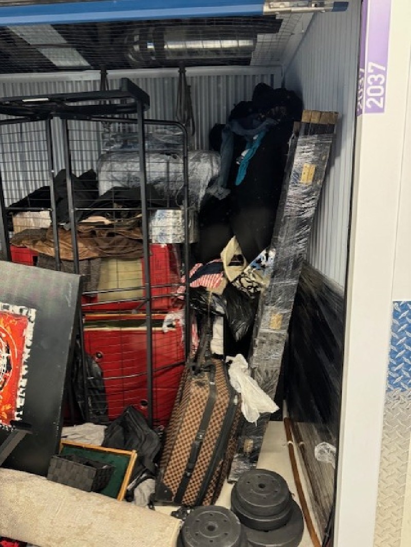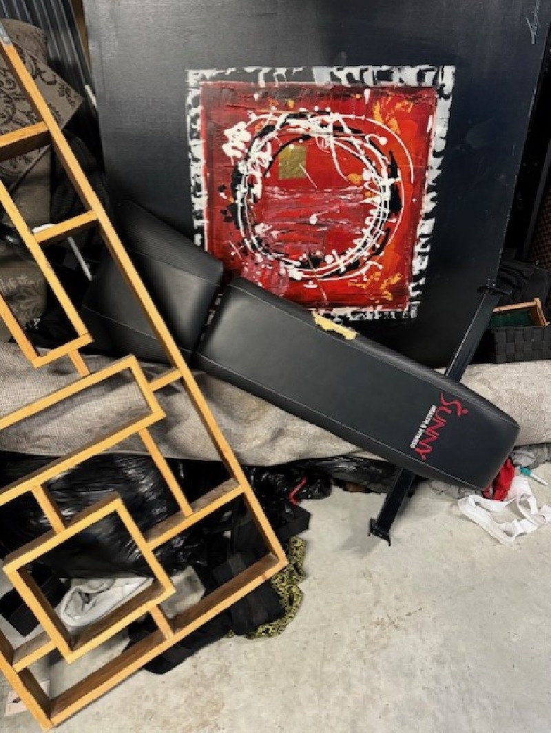 Approx. 100% Full. TV, Weight Bench, Futon Frame, Assorted Furniture, Artwork, Photos, Cabinets, Clothing, Area Rugs and Bags