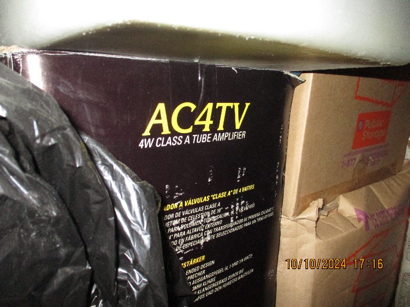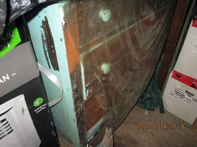 Wooden headboard, lots of boxes, bags, a chest of drawers. The unit A071 is also owned by the same person