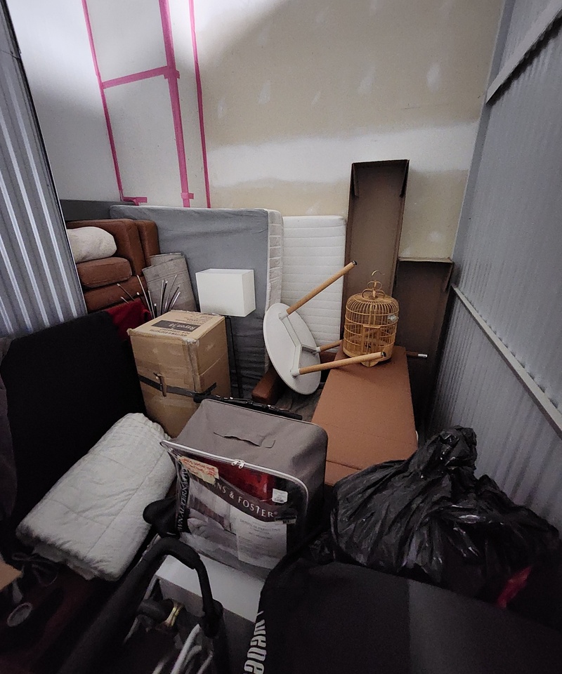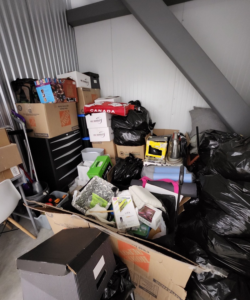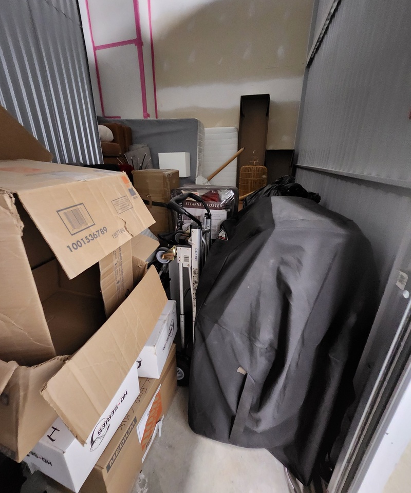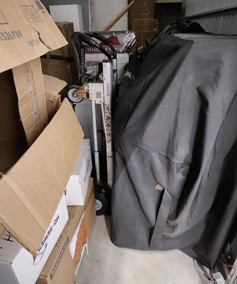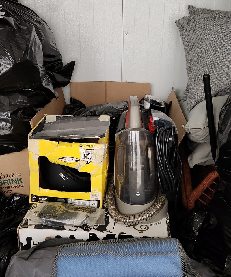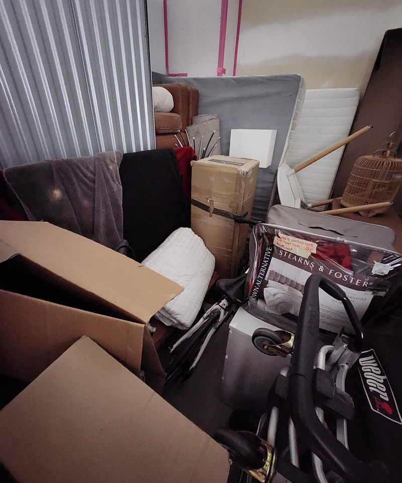 Mattress, couch, table, chair, TV, Dresser, clothes, personal items, tool boxes & misc. tools, misc. boxes & bags, BBQ, dolly, tool chest, desk & chairs, bird cage, carpet cleaner, shopping trolly