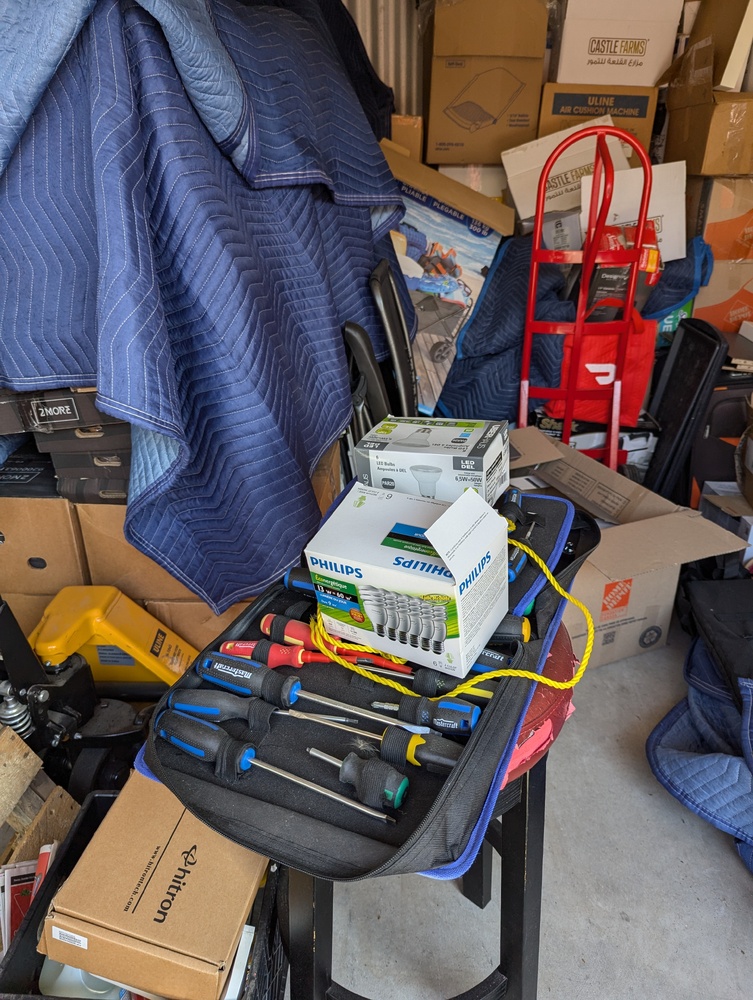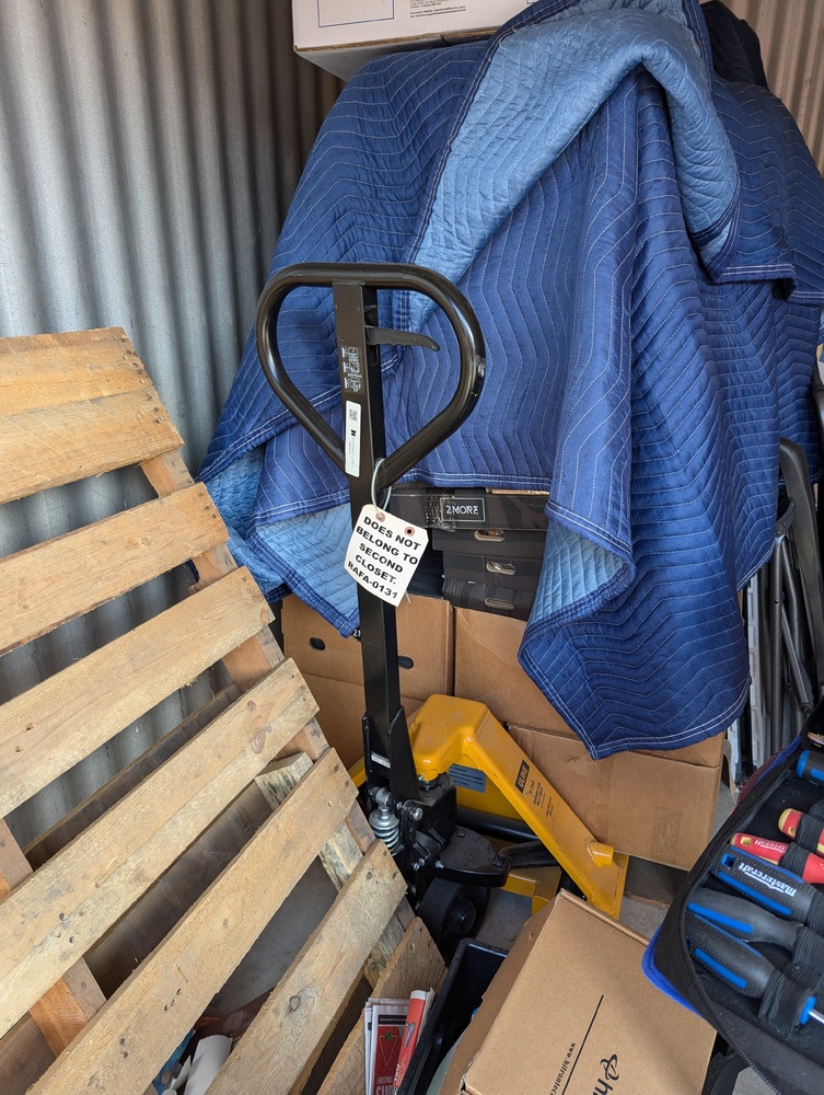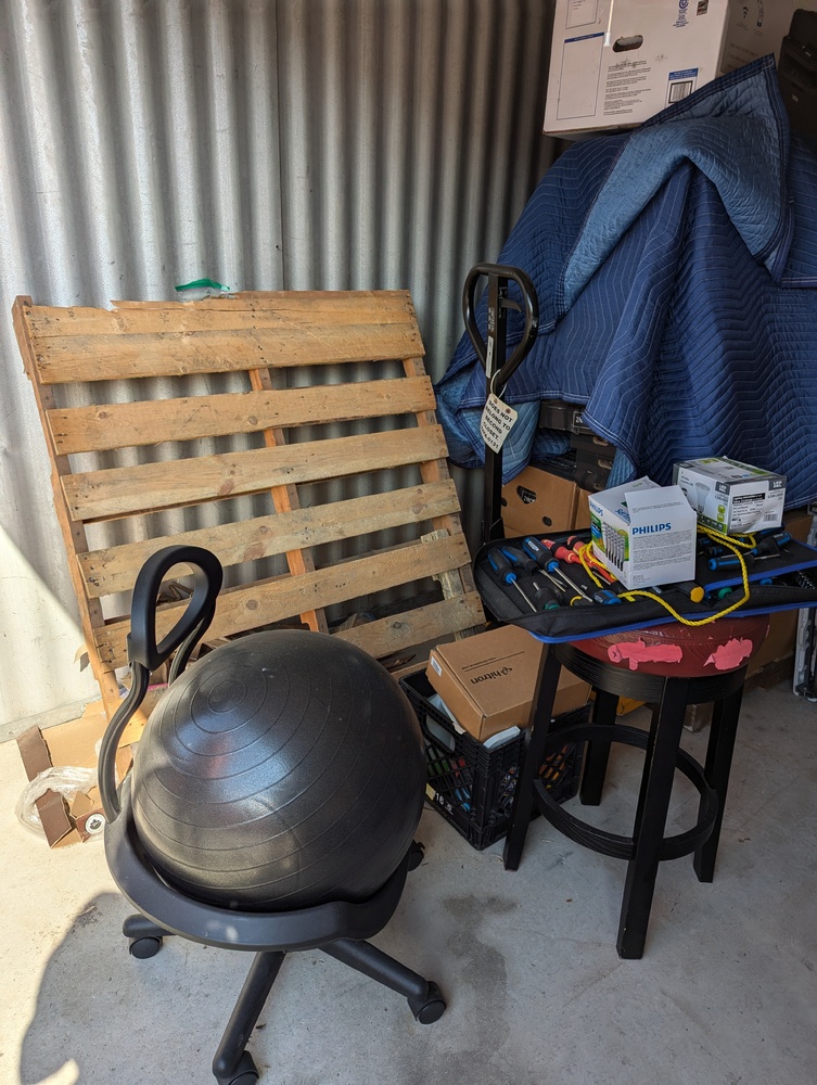 misc furniture, office chair, misc boxes, dolly, pump truck, gravity chair, tools, cordless drill, suitcase