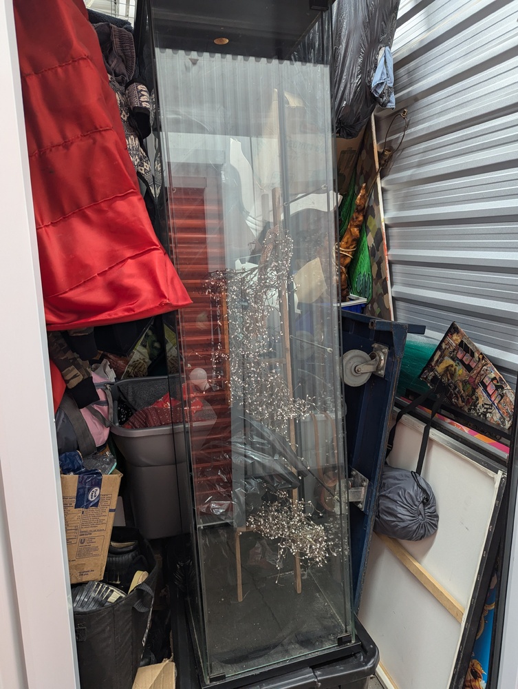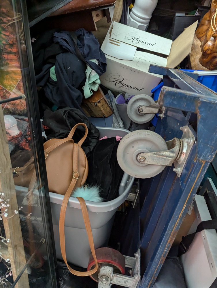 misc furniture, display case, misc totes/boxes, wall decor, home decor, albums/LPs, dolly/rolling platform, tv stand, clothing