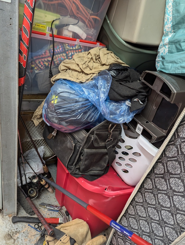 fishing rods, misc totes/bags, ladder, misc furniture, wall decor