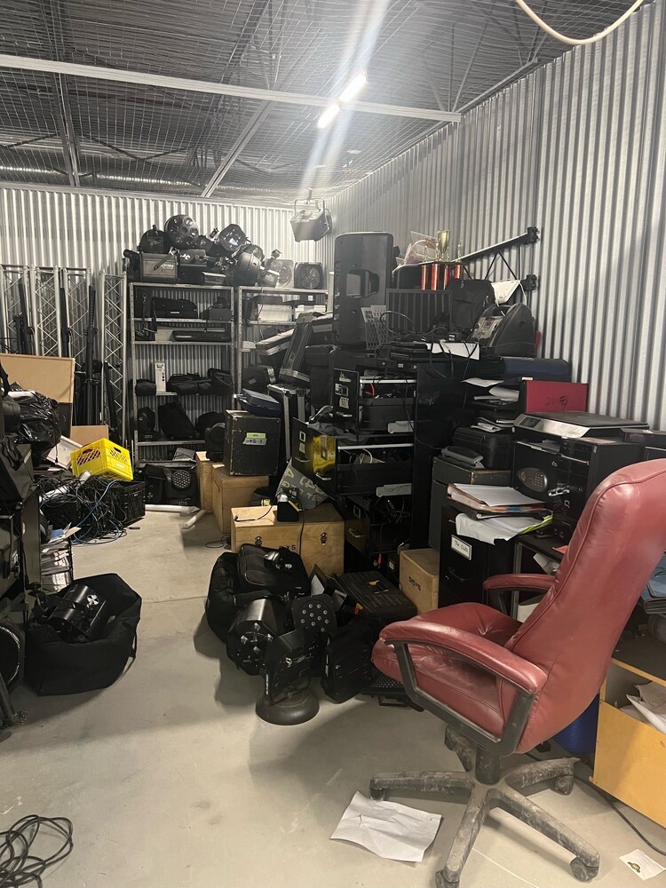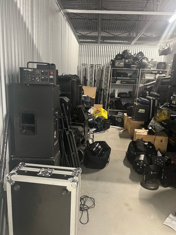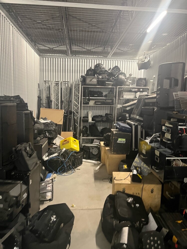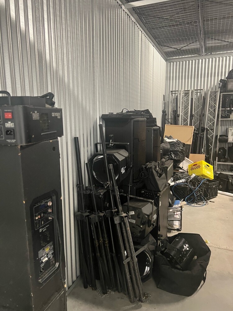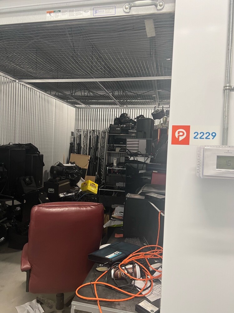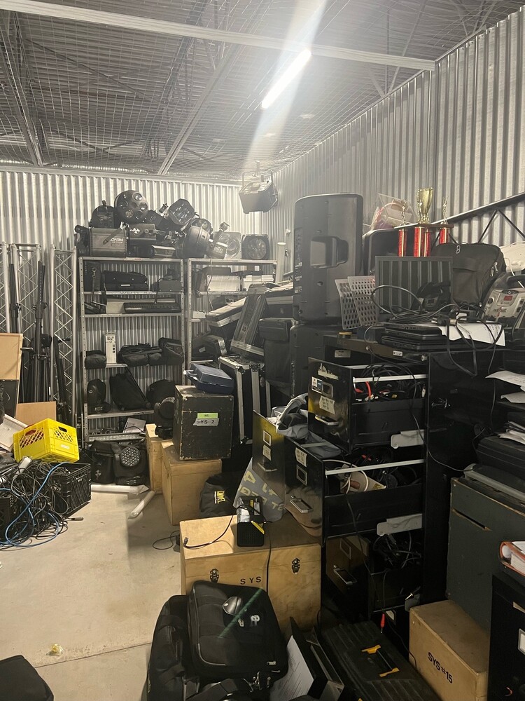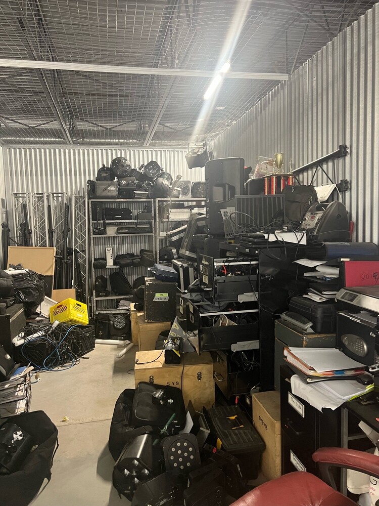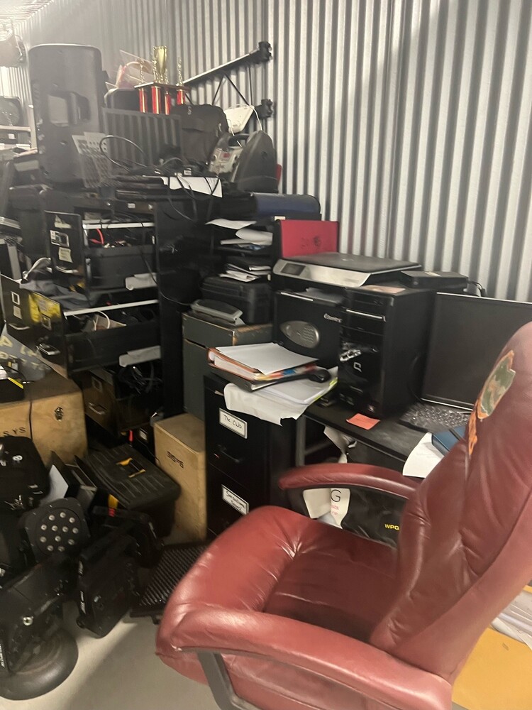 This 10x20 unit contains D.J. equipment, an office chair, file cabinets, and computer equipment.