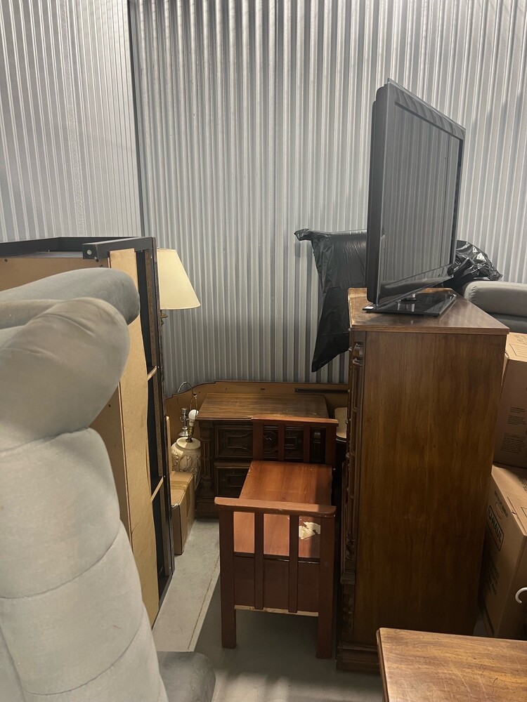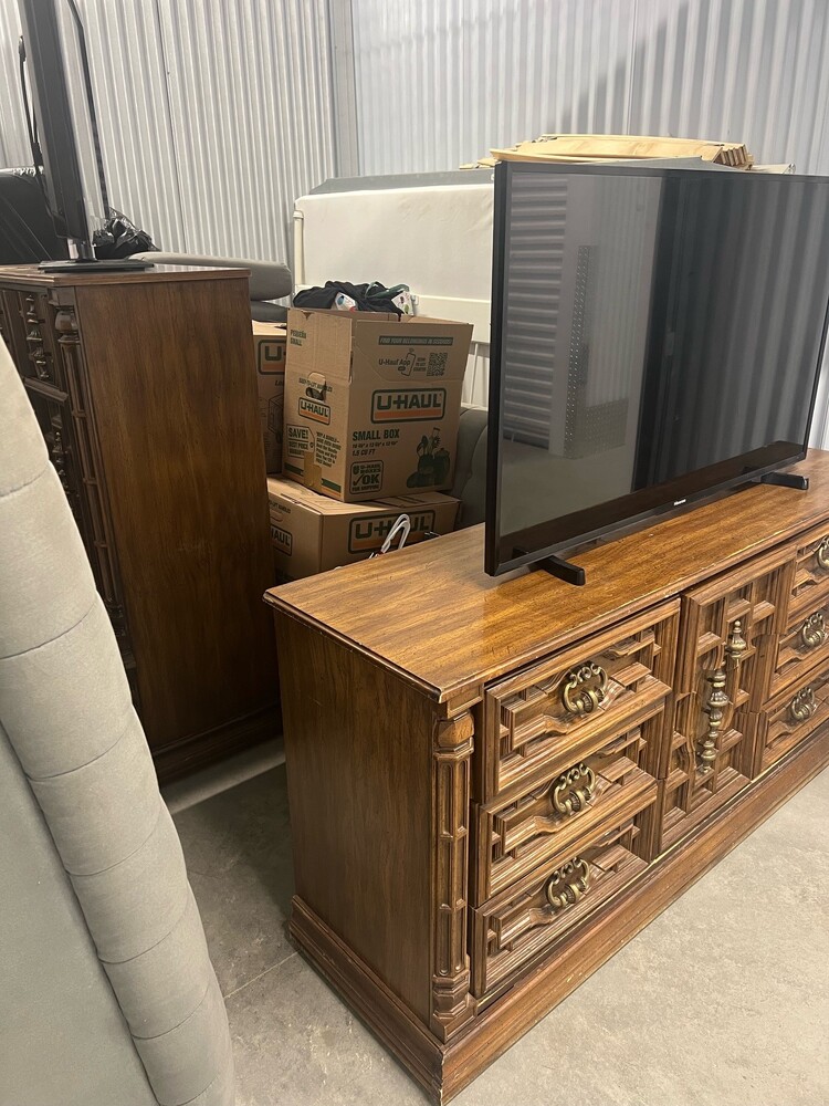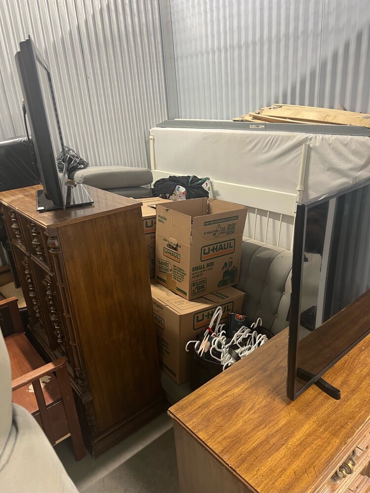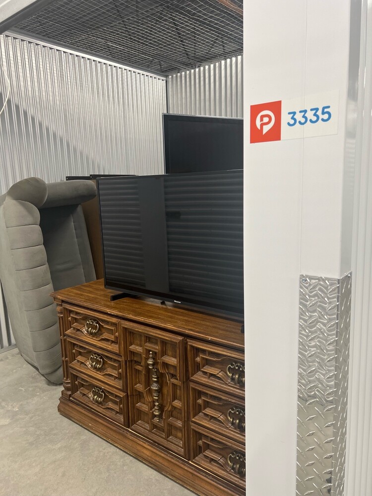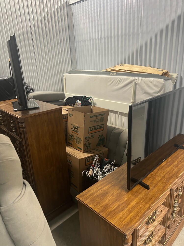 This 10x10 unit has two TVs, bedroom furniture, a couch, and boxes.
