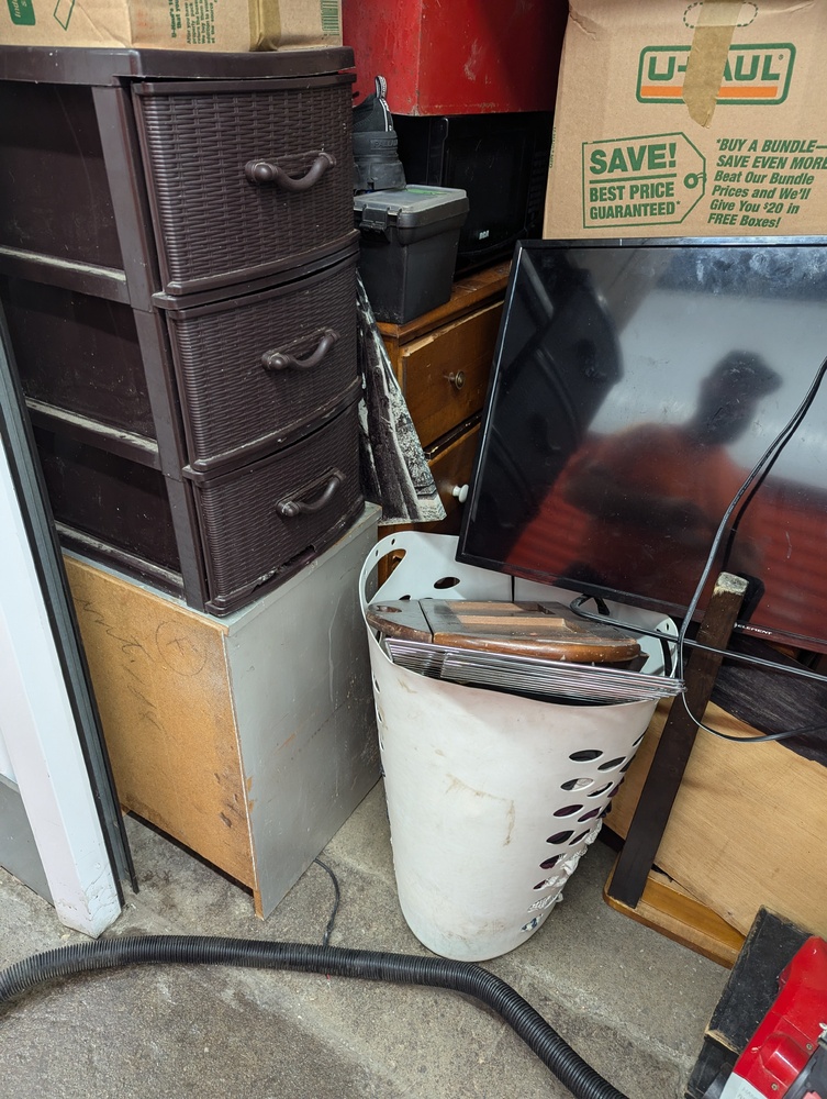 TV, misc boxes, vacuum, lamp, tool box, dresser, night stand, cabinet, misc furniture