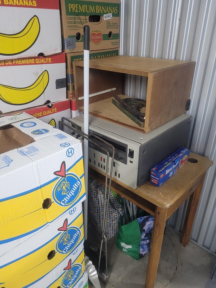 Unit contains a comb binding machine, a Sony videocassette player, boxes, plastic totes, a table, ect. . .