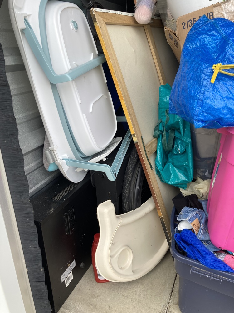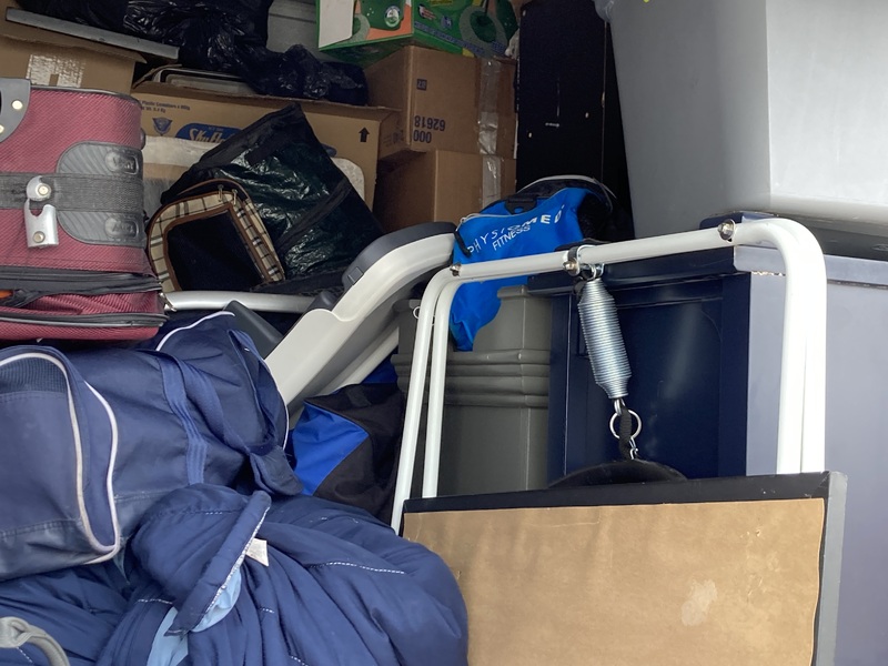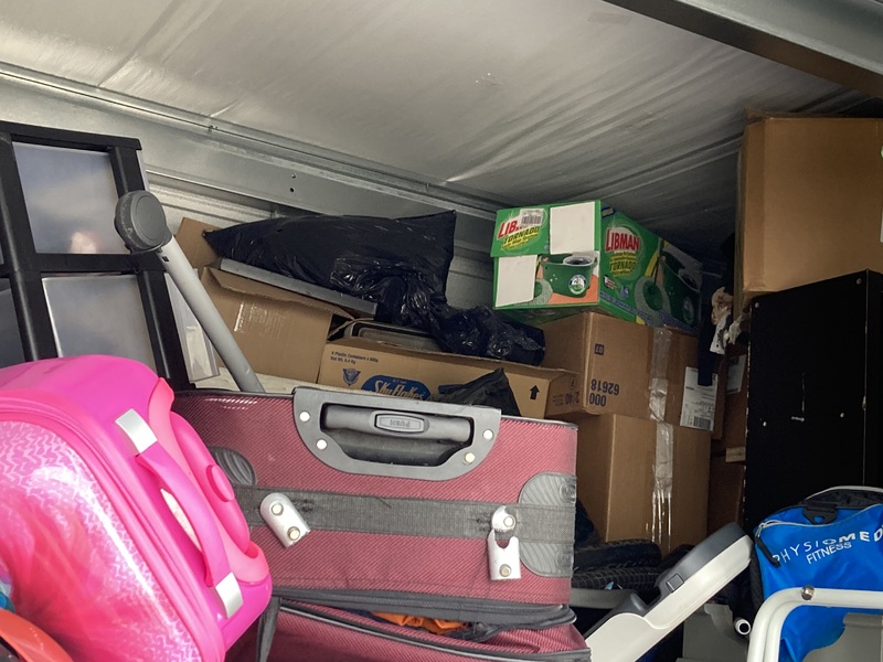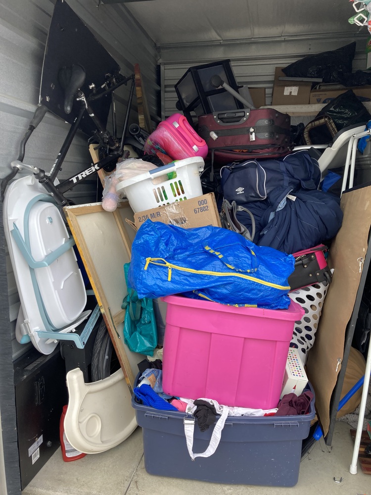 Totes, boxes, furniture, pictures, tools, suitcases, bicycle and baby items.