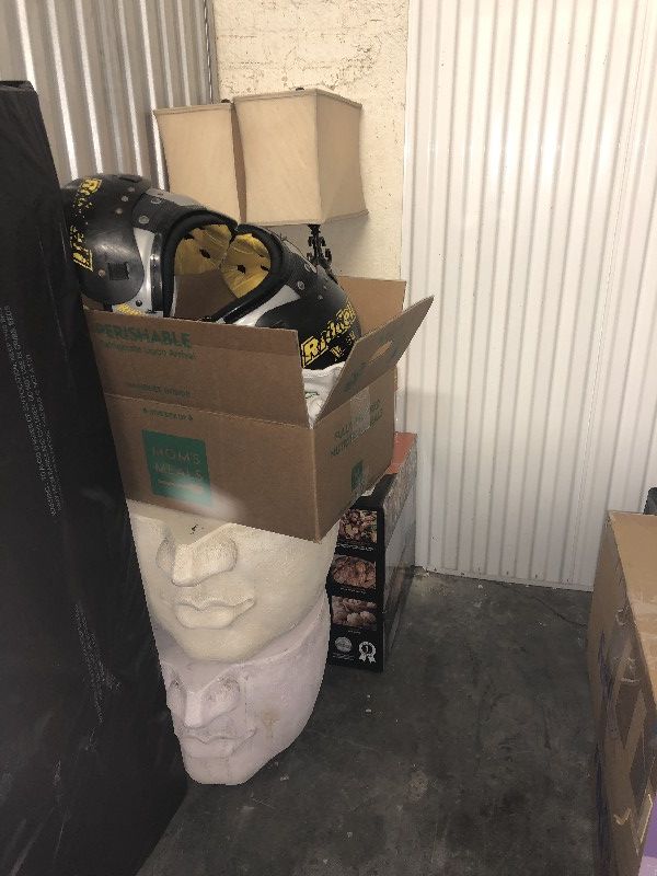Dive into a uniquely eclectic storage unit up for auction, featuring an array of distinctive items to complement your lifestyle. From elegant lamps casting a warm glow to neatly packed boxes concealing treasures, this unit also holds football shoulder pads for the sports enthusiast. Adding a touch of whimsy, discover end tables shaped like faces, ensuring this collection is as diverse as it is captivating. Bid now to make these one-of-a-kind pieces yours and infuse your space with personality and flair!