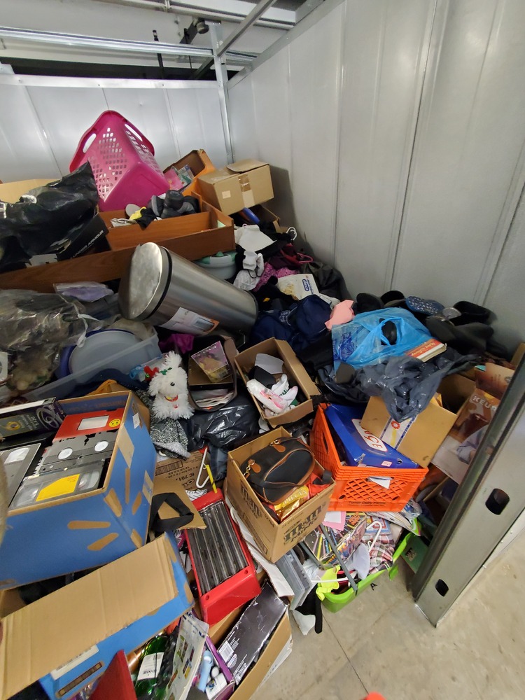 appears to be house hold items, vhs tapes, bags, boxes, clothes