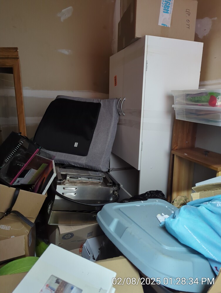 misc totes/boxes/bags, dresser, cabinet, bbq, shoe rack, mirror
