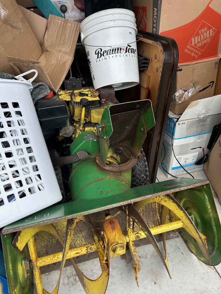 boxes, bags, clothes, table, snowblower, fishing gear.