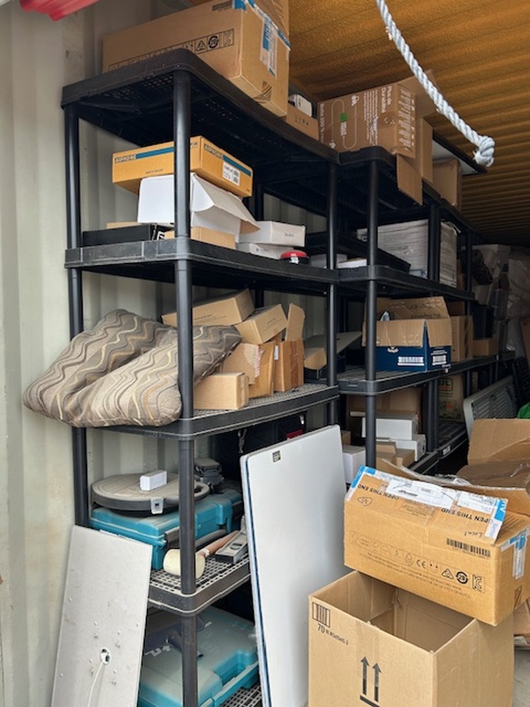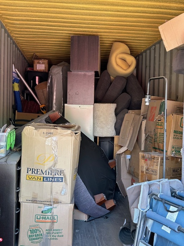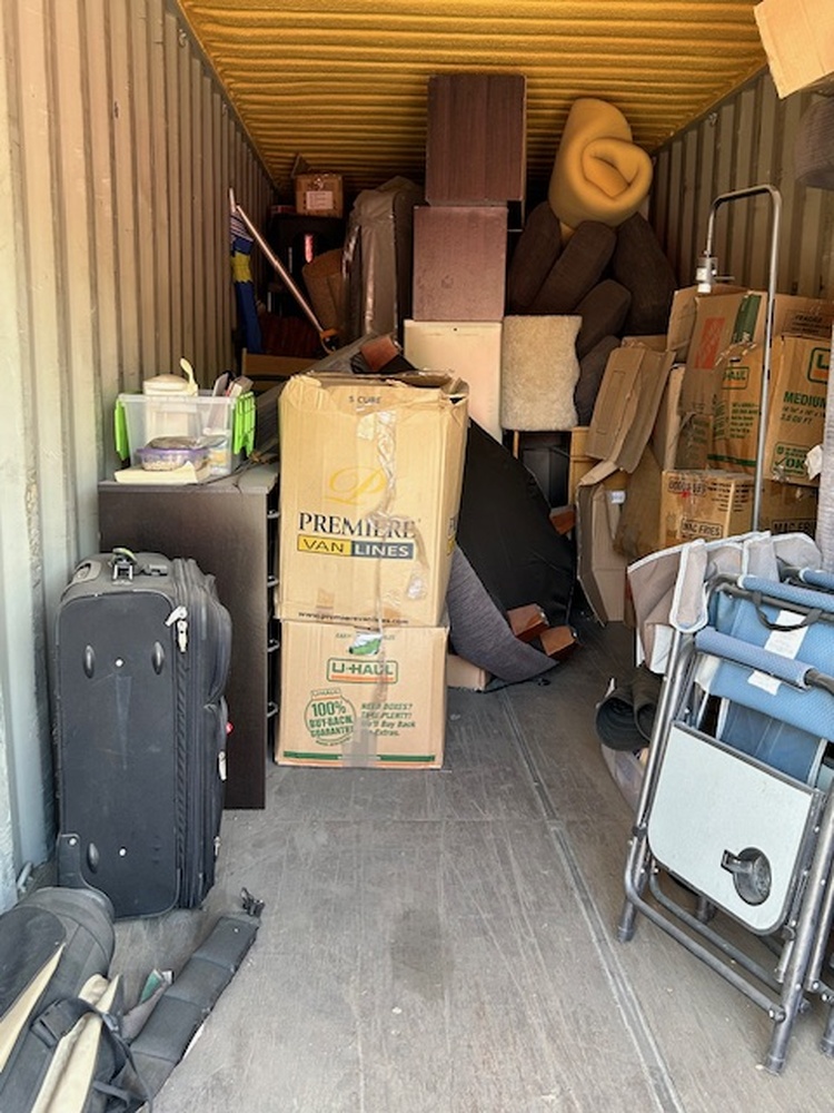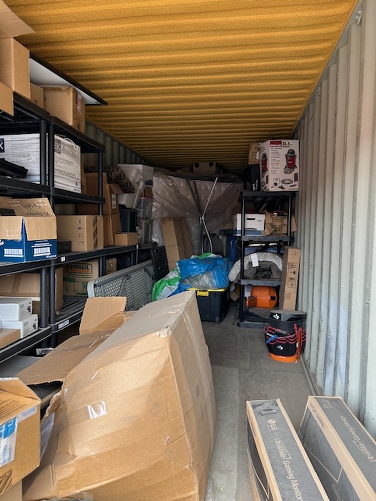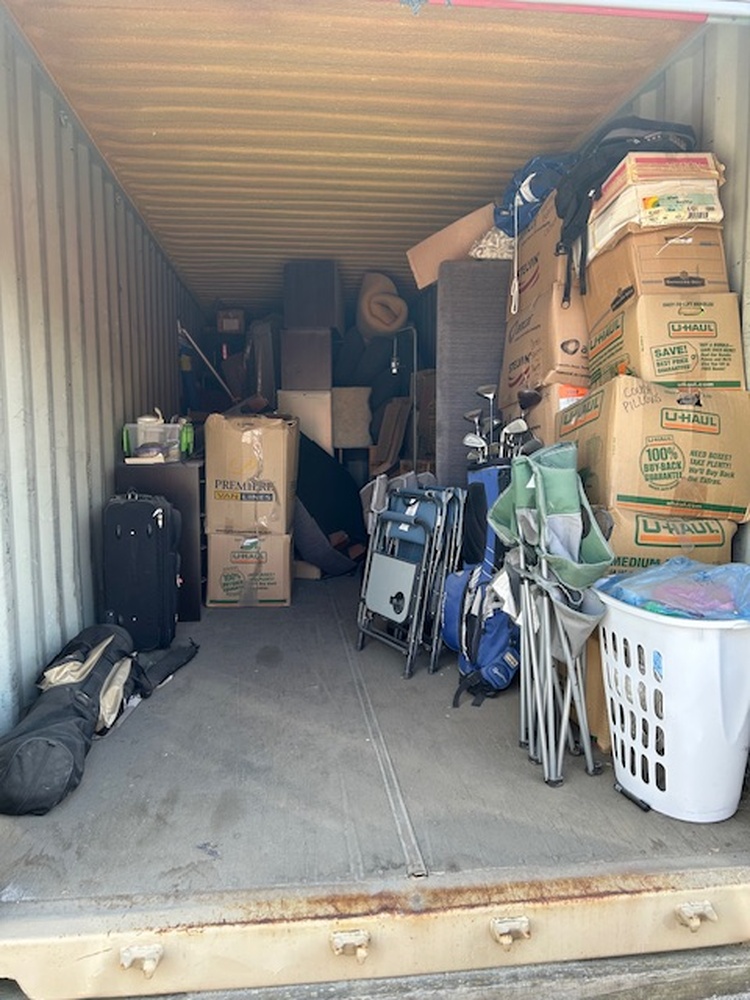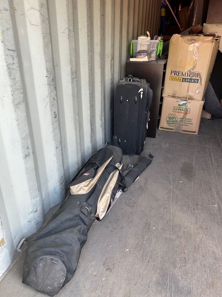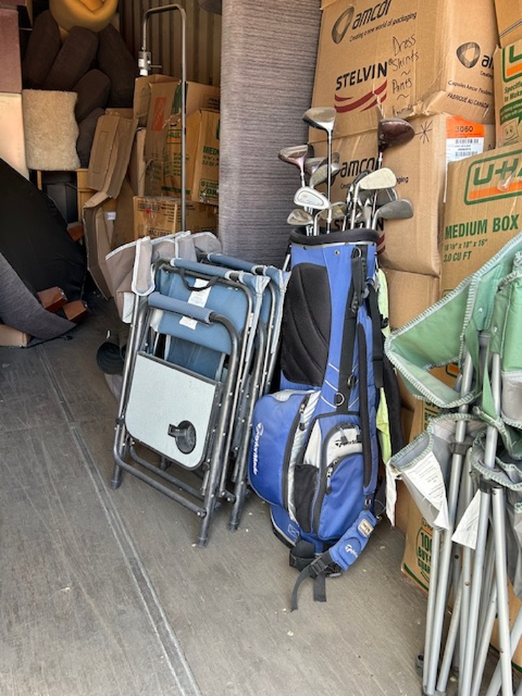 This is a large unit that has it all by the looks of it. There is a door on either end and right in the middle has household items. There are boxes and furniture. There are also outdoor items too. There are lawn chairs and gulf clubs.
