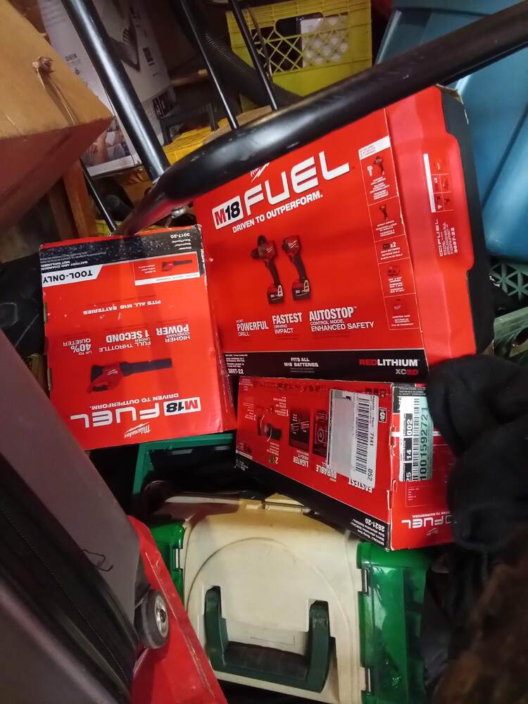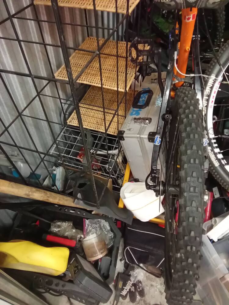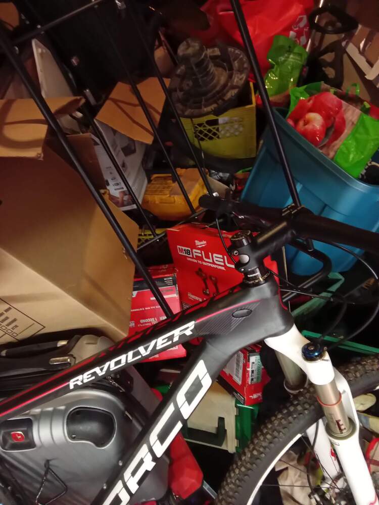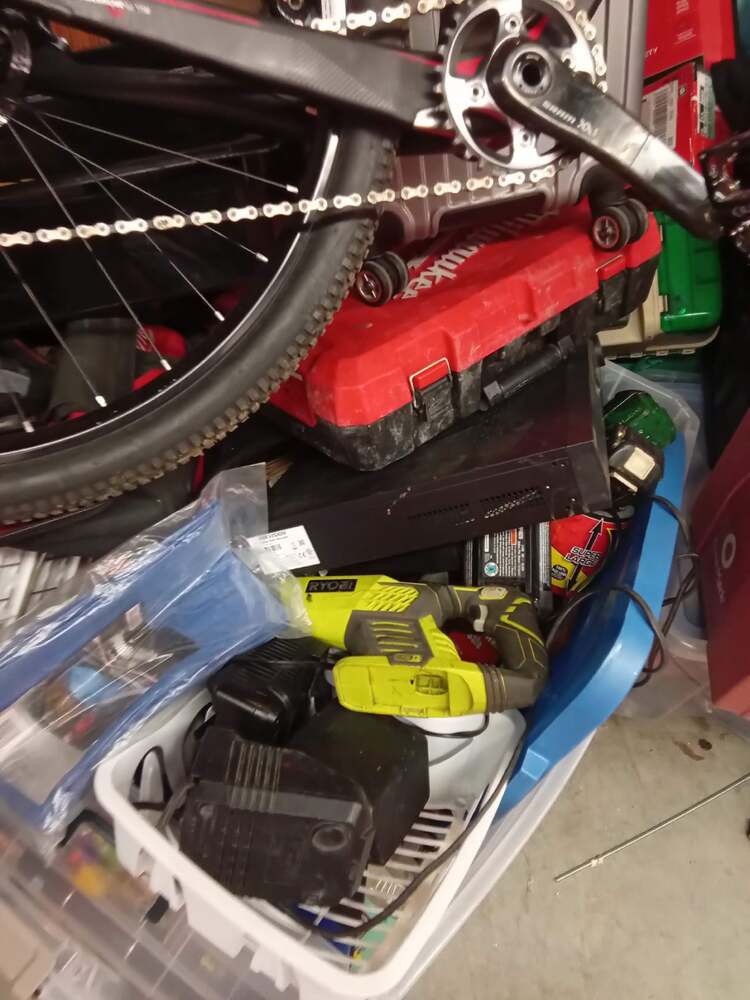 Norco revolver bike, Brodie rocket bike, Rugs, Shelving, Boke helmet, Tarp, Power tools, Fishing rods, Street signs, Hikvision dve