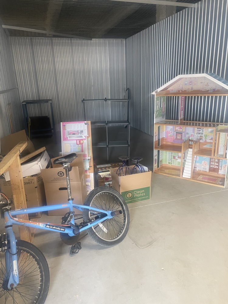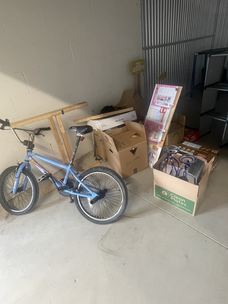Bicycle, kids toy house, boxes, wooden stuff, table, decorative glass vase, etc.