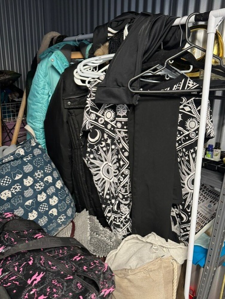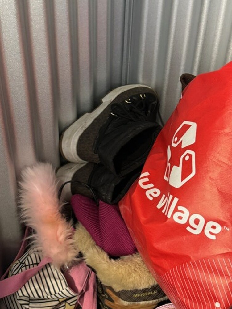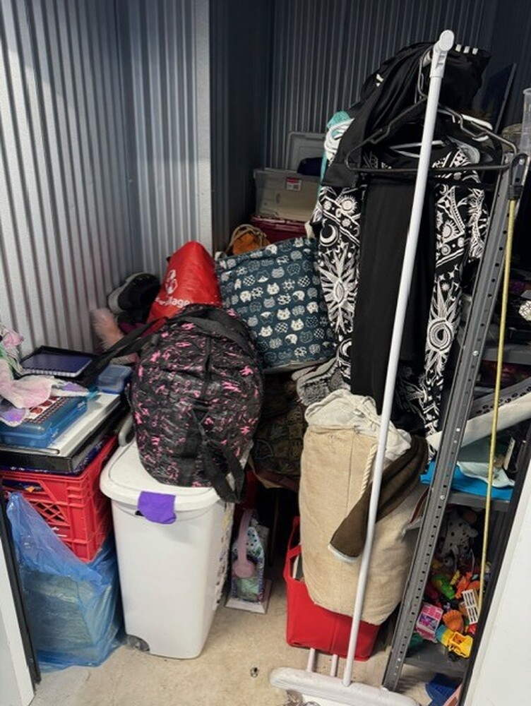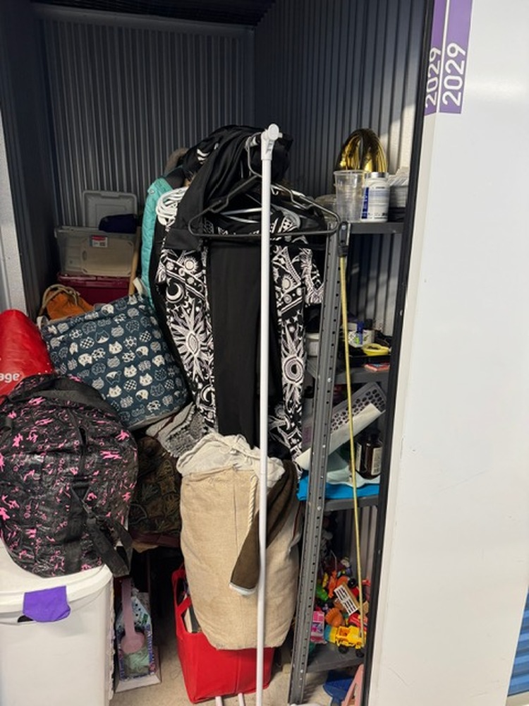 Approx. 75% Full. Headphones, Skies, Clothing Rack, Shelving, Shoes, Clothing, Jackets, Books, Toys, Bags and Totes.