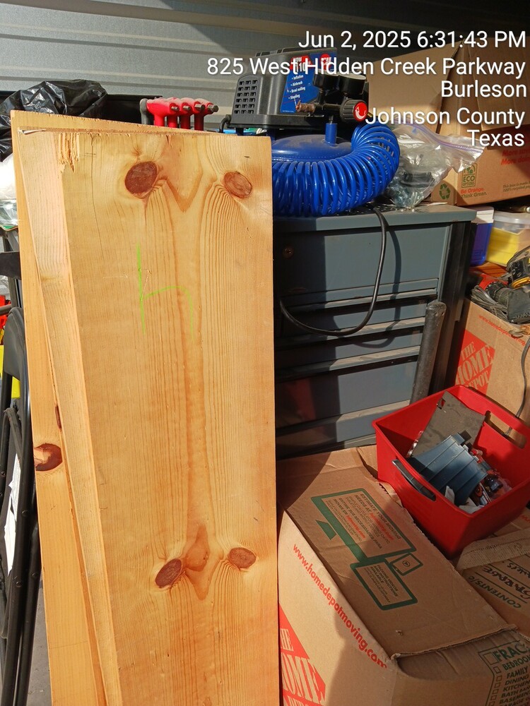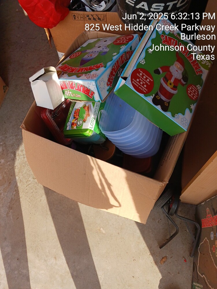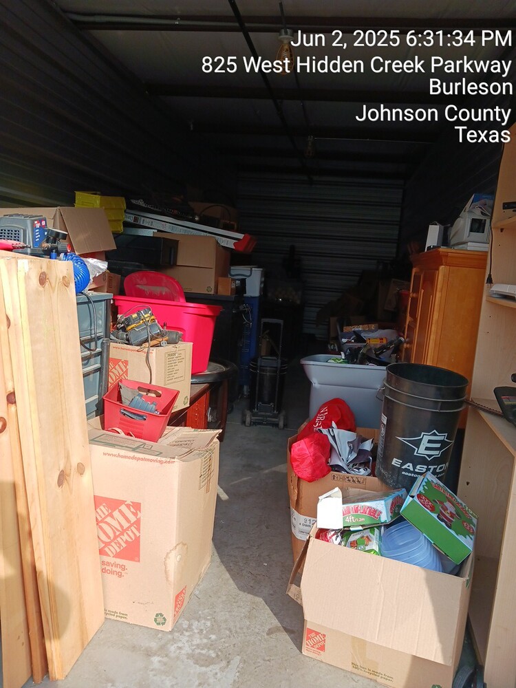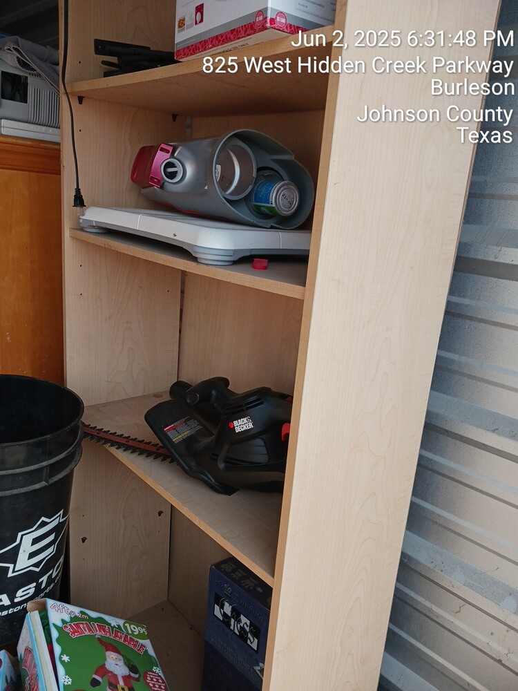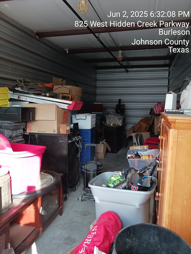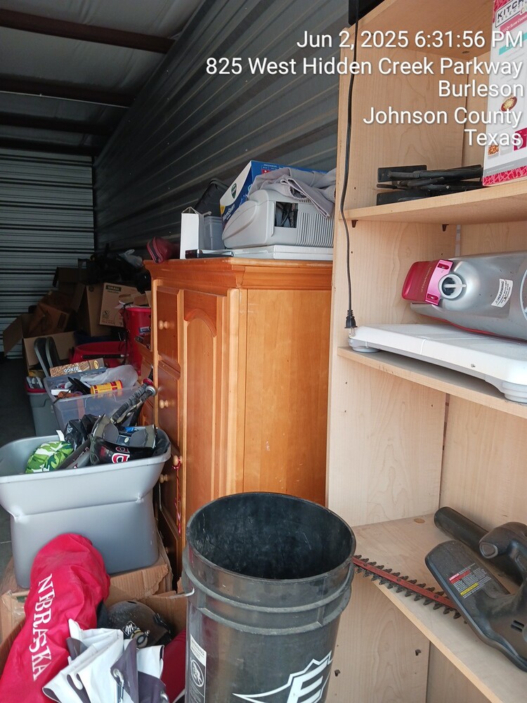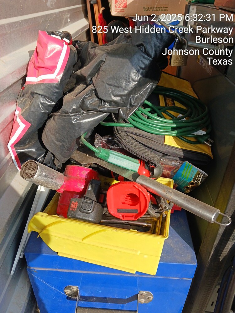 Shelves, Tool Boxes, Dresser, Decor, TV stand, Ladder, Boxes, Baseballs, Hose, Bins, Misc. items