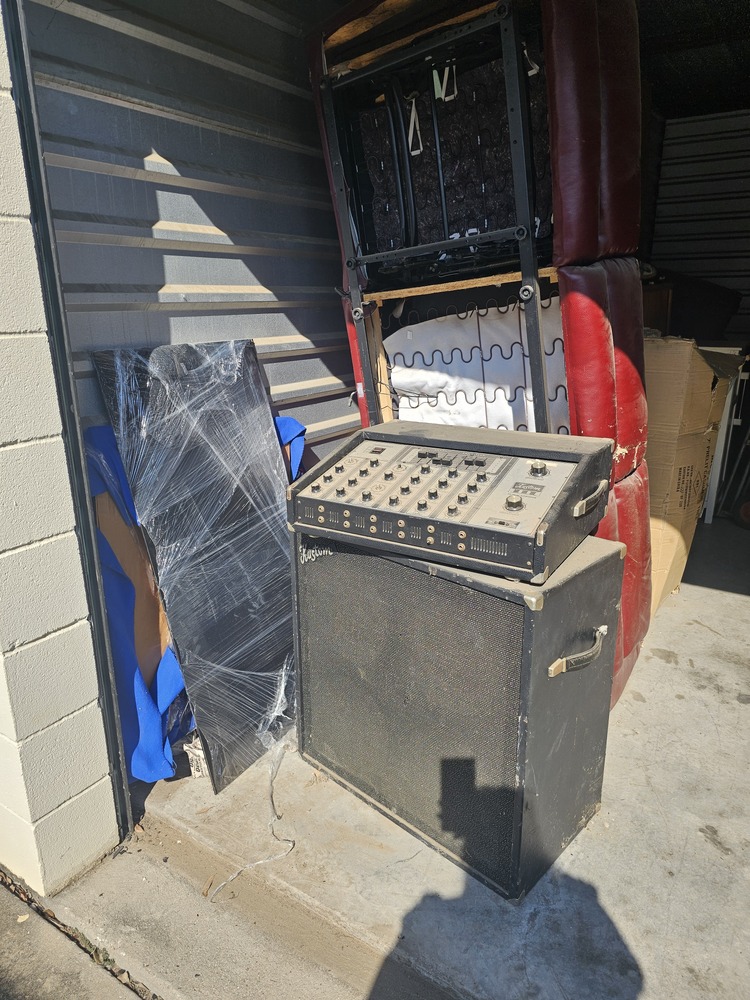 Boxes, Dolly, sofas, love seat, TVs, tire, shelf, Amp, Sound board, speakers. Misc. items