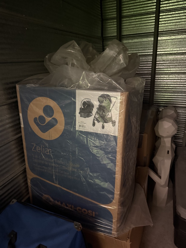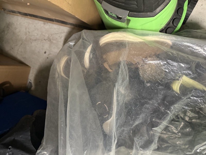 Kid stroller, bag of shoes, sink, boxes, mannequin etc.