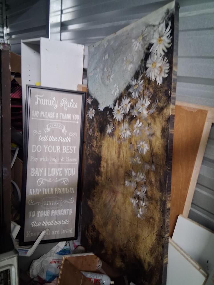 Laptop, furniture, frames, art work, clothing, boxes and bags