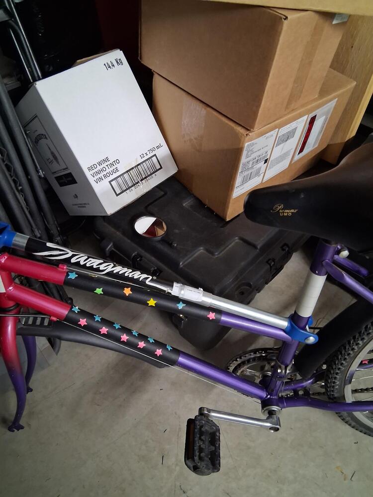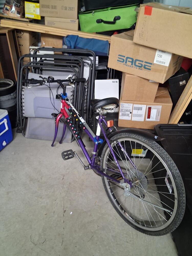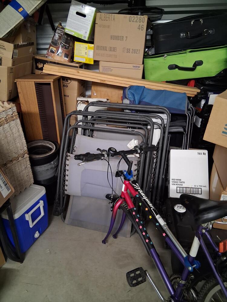 4 tower speakers, bicycle, camping equipment, christmas tree, storage tubs, boxes, bags, totes, area rugs. scrap wood, a bit of furniture, planters, fan