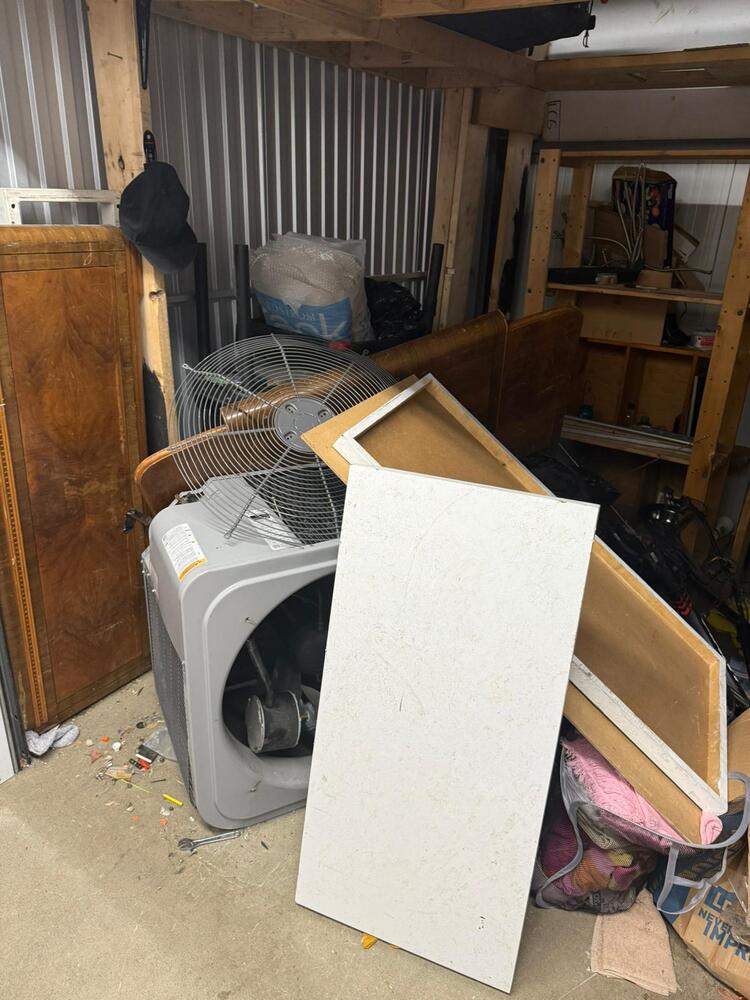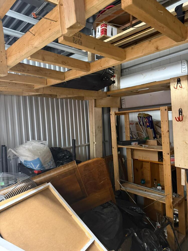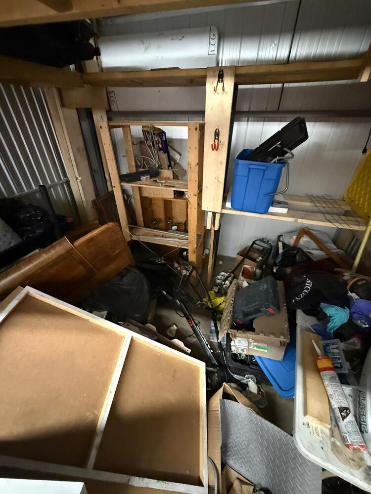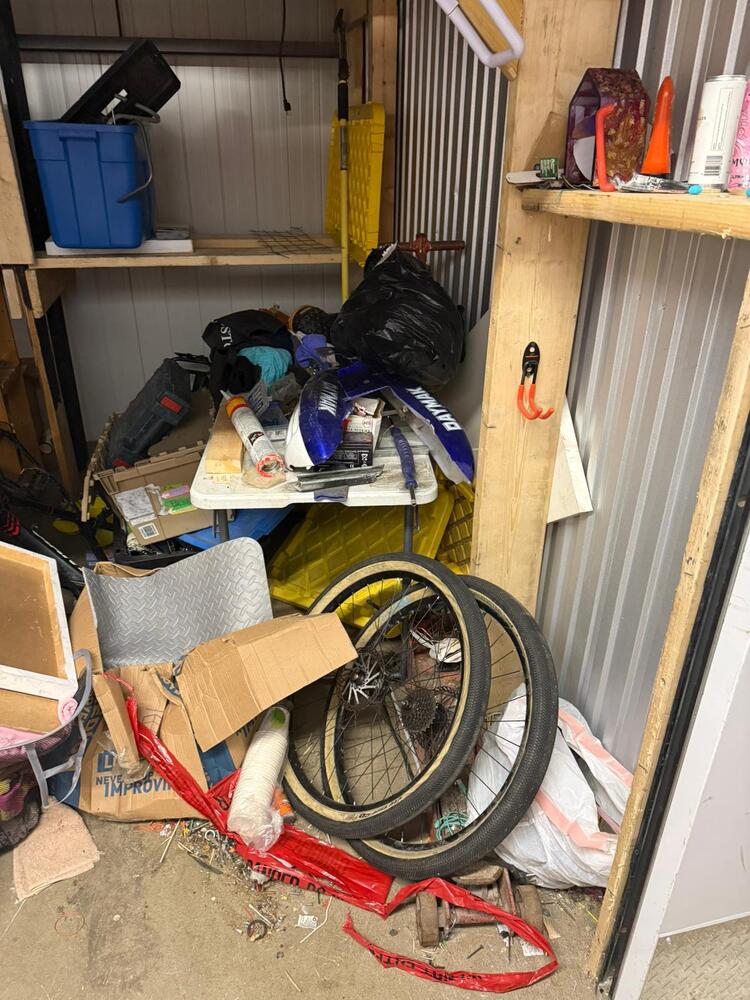 Miscellaneous tools, bed frame, bins, bicycle parts