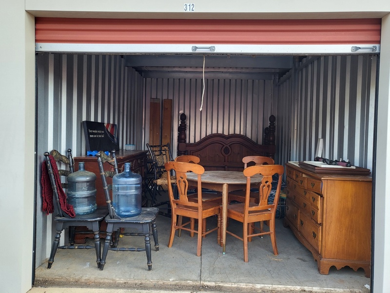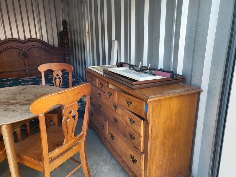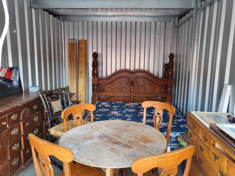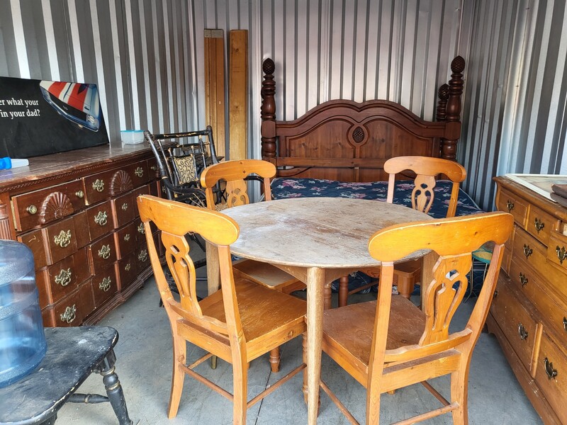 Unit appears to contain a dining set, other dining chairs, 2 dressers, wood bed with slats