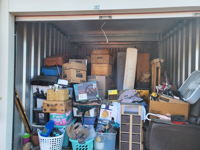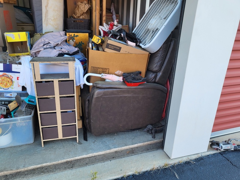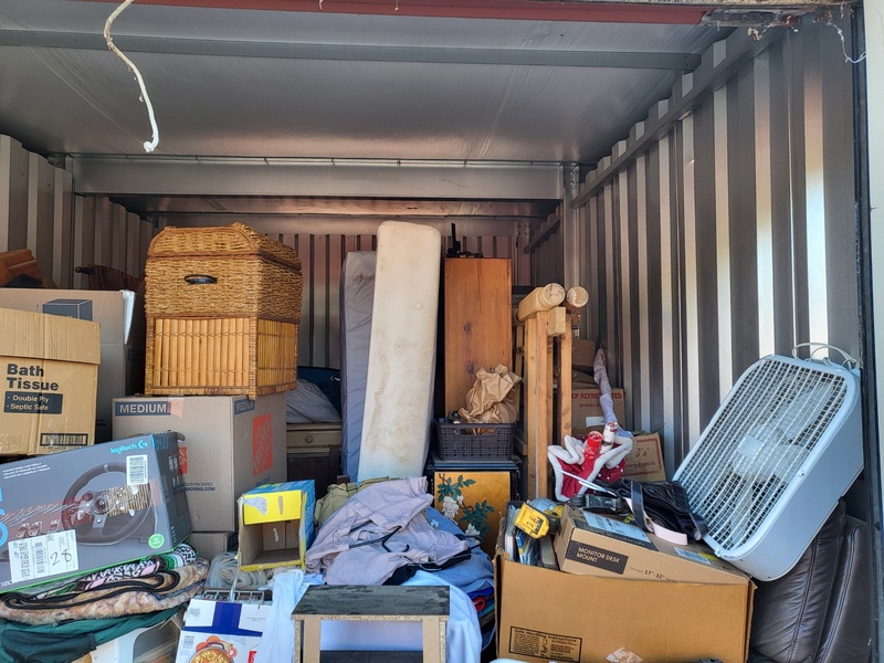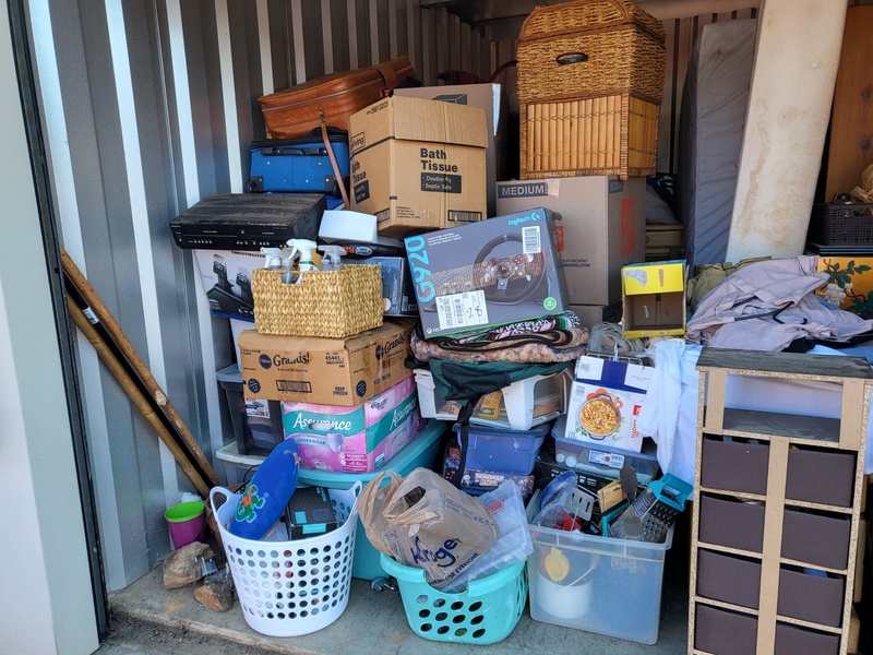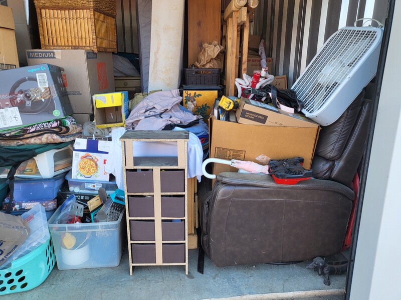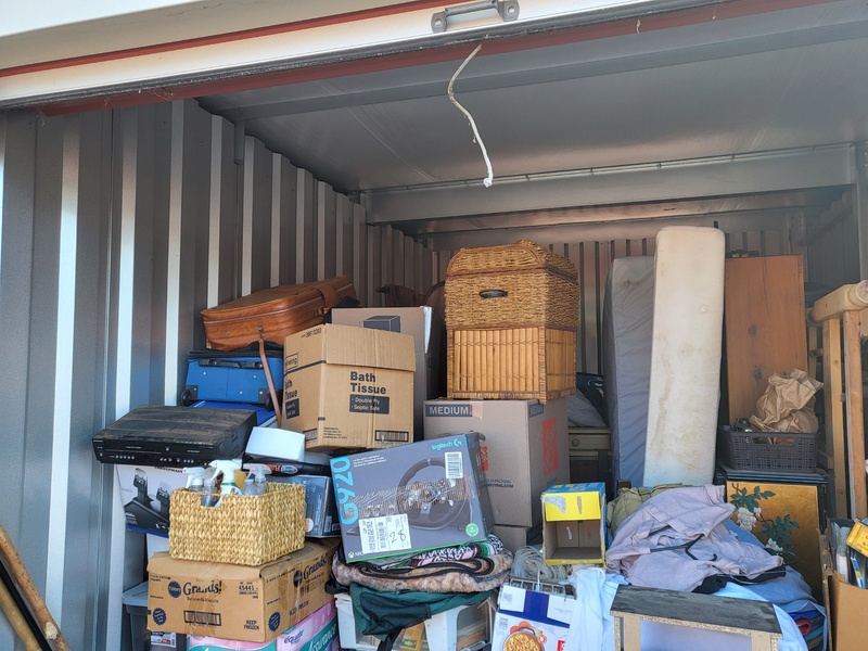 Unit appears to contain furniture, boxes, luggage, dishes, fan, VCR, tools