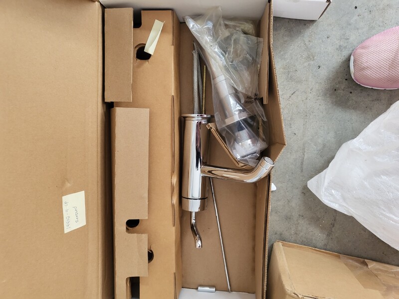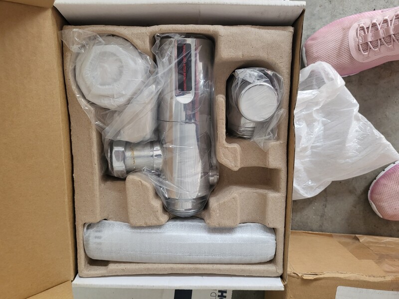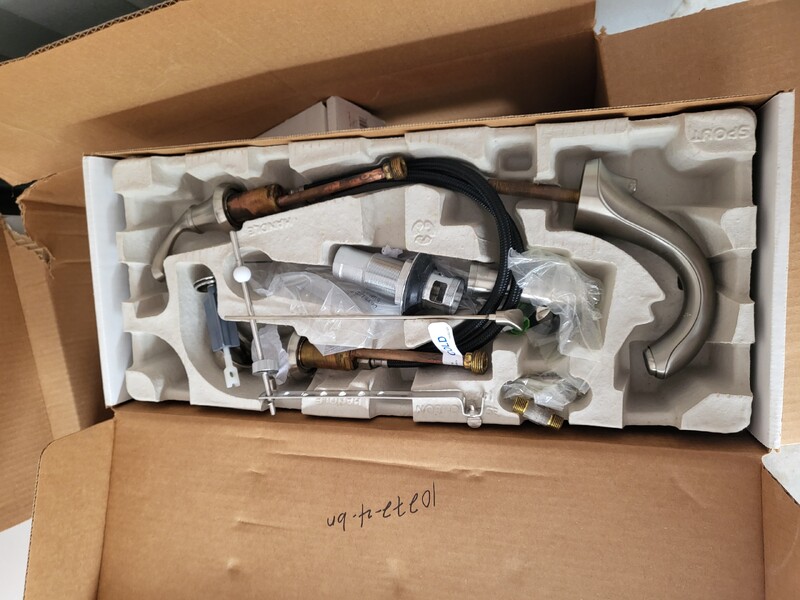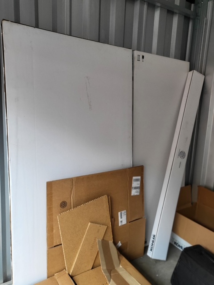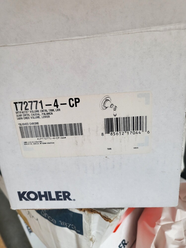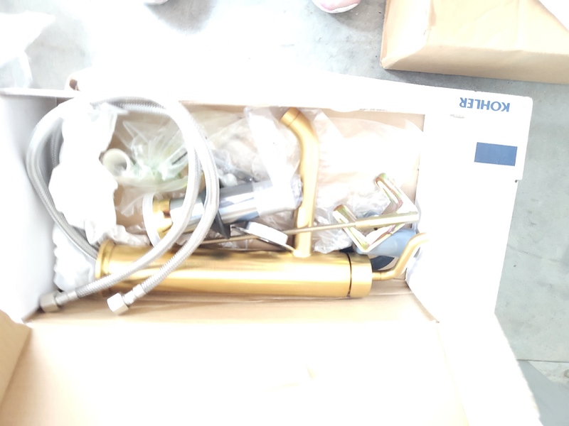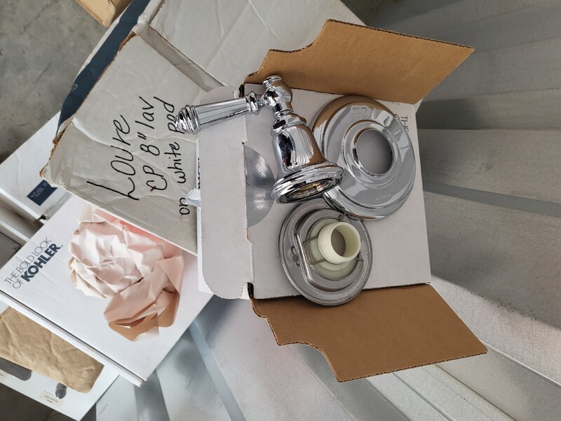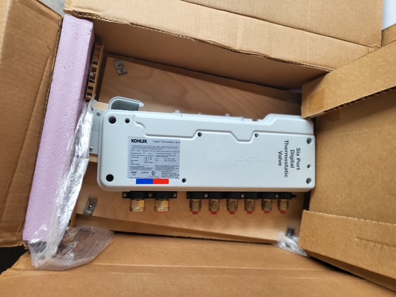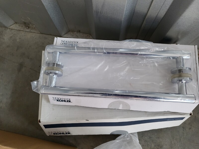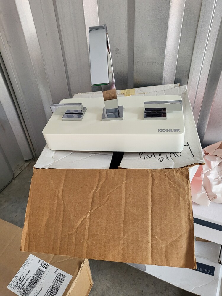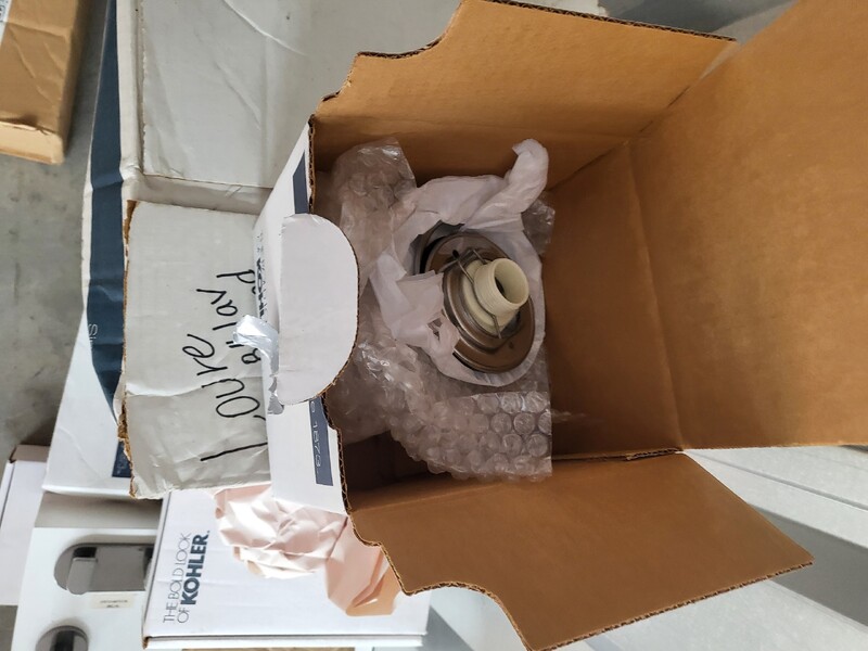Unit contains NEW IN BOX Kohler brand fixtures and parts: glass shower doors, plumbing fixtures with kits, digital thermostatic valve.
