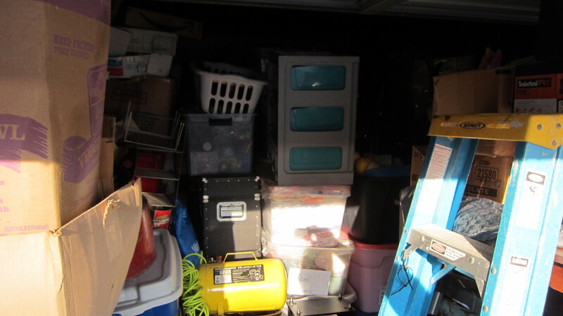Big mixer, kids books, boxes, bread maker, book shelf, rug, misc sockets, tool boxes, dog kennel, metal shelves, 6' ladder, hitch for a truck and yard tools.