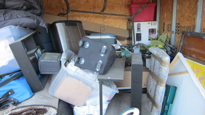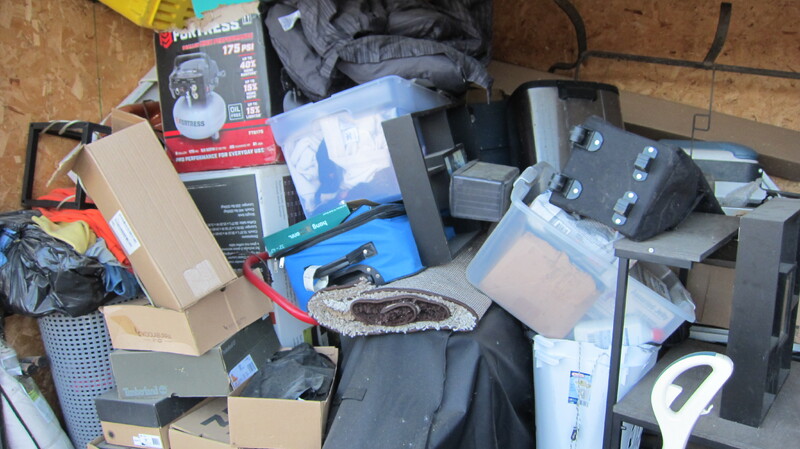 Boxes, clothes, picture frames, weed eater (battery), carpet cleaner, folding chair, coffee table, kitchen trash can, yard chairs, grill, plastic bins, truck hitch, cooler, deep fryer and stove top for food truck.