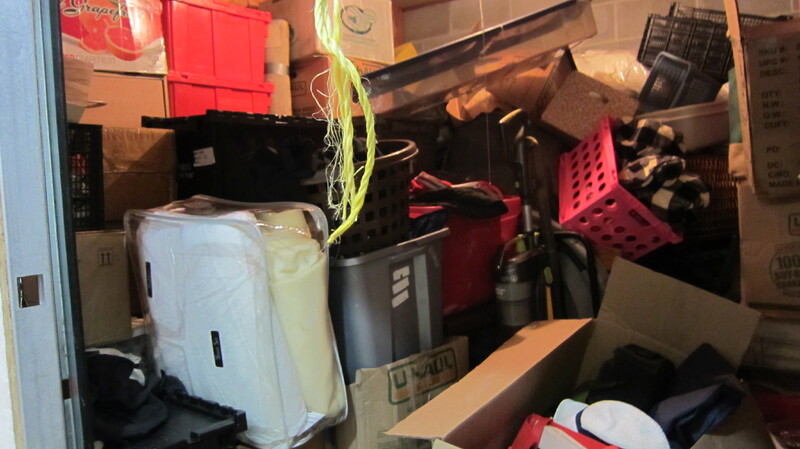 Boxes, clothes, TV dinner trays, plastic bins and vacuum.