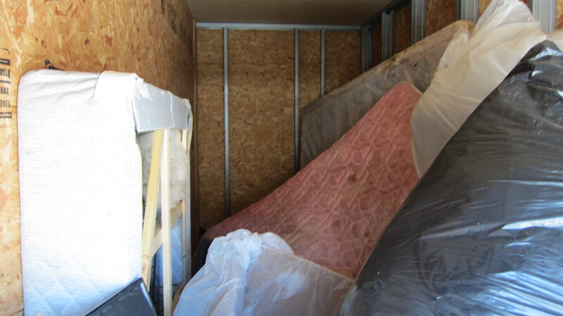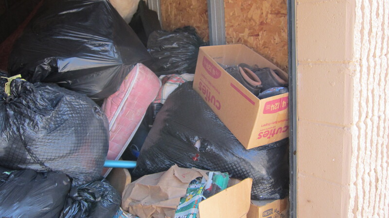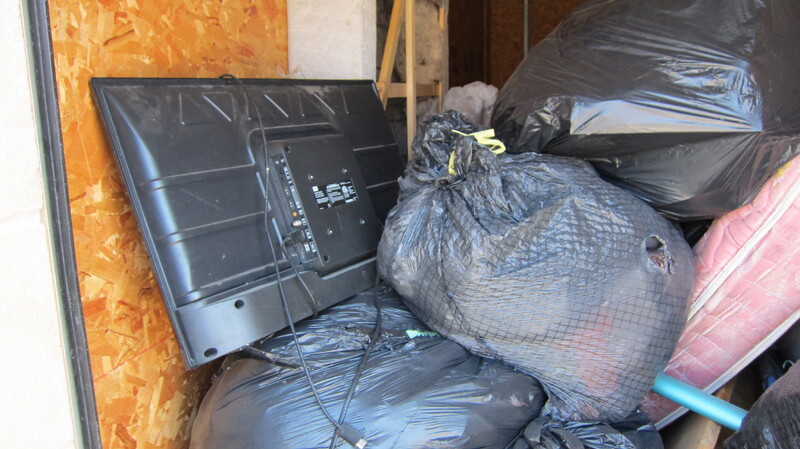 Boxes, clothes, small TV, beds, luggage, lots of trash bags and purses.