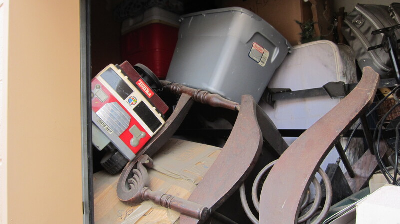 Toy truck, office chair, boxes, clothes, full size mattress, rolling table, metal bed frame, plastic bins, luggage, bedding and wooden end tables.